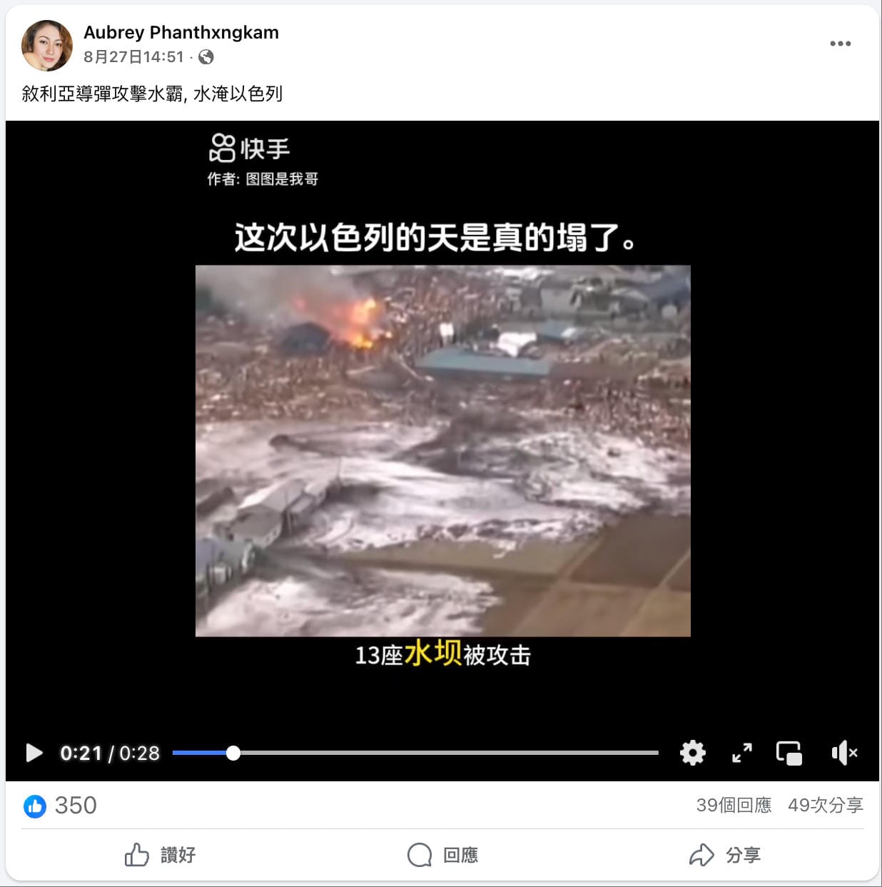 2025年8月27日,Facebook用戶「Aubrey Phanthxngkam」發佈一段由多個片段剪輯而成的影片,並宣稱「敘利亞導彈攻擊水霸,水淹以色列」。影片可見城市出現洪水的畫面,旁白宣稱以色列13座水壩被攻擊後引發水災,導致超過8,000名士兵失蹤。[1]該影片觀看次數超過1.6萬,獲得49次分享、39個回應以及350個表情反應。