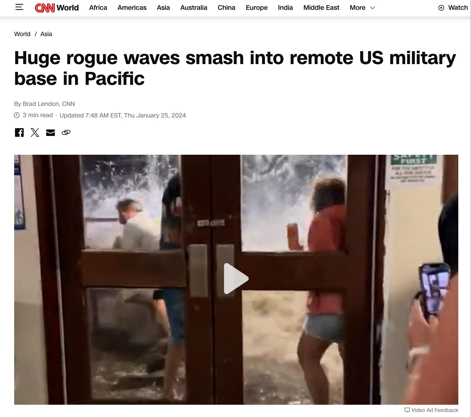 以影片第20秒至第28秒截圖作逆向搜尋,可發現《CNN》 於2024年1月發佈的報導,所附影片與網傳片段一致。報導指出,2024年1月美軍位於太平洋馬紹爾群島(The Republic of the Marshall Islands)一處軍事基地遭巨浪衝擊,片段顯示海水湧入Roi-Namur島嶼上的一間餐廳。[15]
