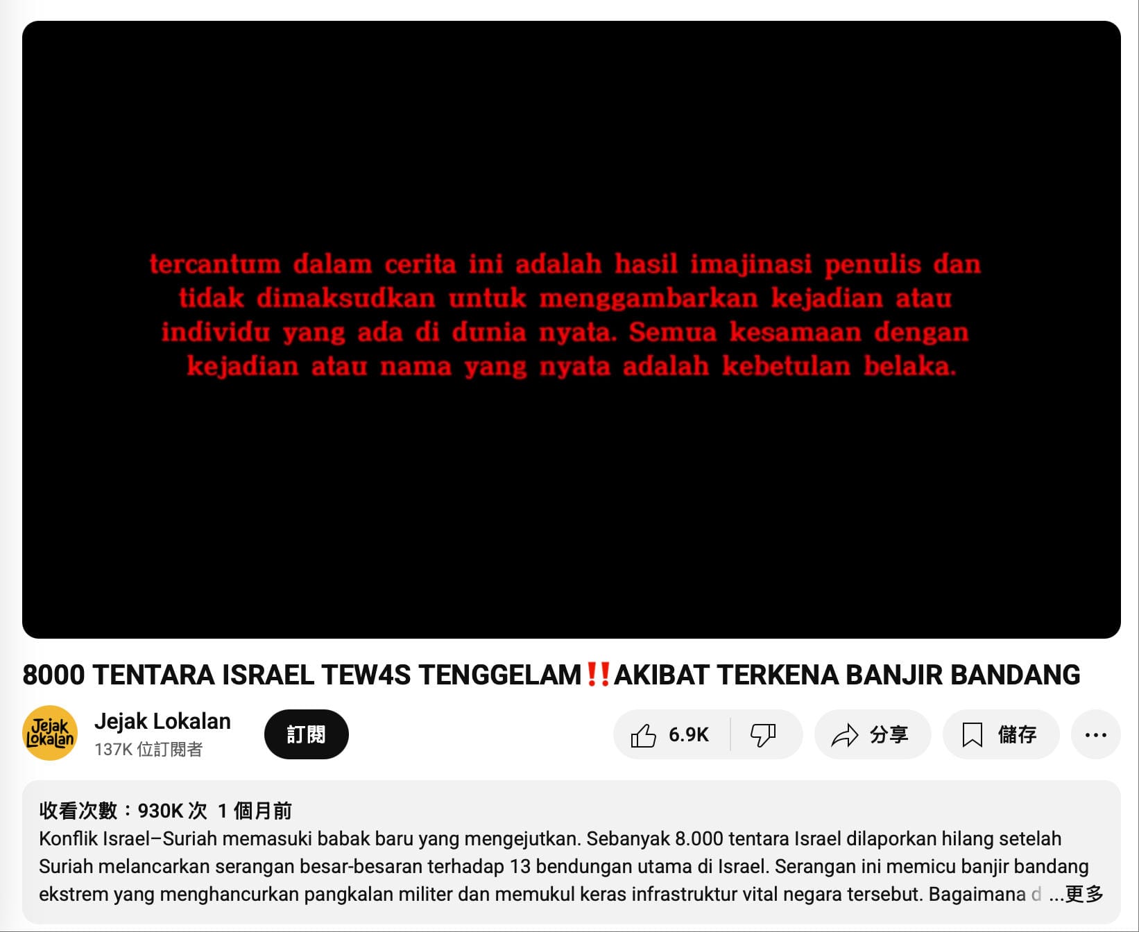在Google搜尋「Israel flood 8000 soldier」,可發現印尼語YouTube頻道「Jejak Lokalan」2025年7月發佈的影片。[16]使用Google翻譯理解,影片簡介聲稱「敘利亞對以色列13座重要水壩發動大規模襲擊,導致逾8,000名以色列士兵失蹤」,與網傳說法一致。然而,影片開始時的紅色字幕和簡介結尾表示,片中描繪的所有人物、組織、地點和事件純屬虛構。[17,18]