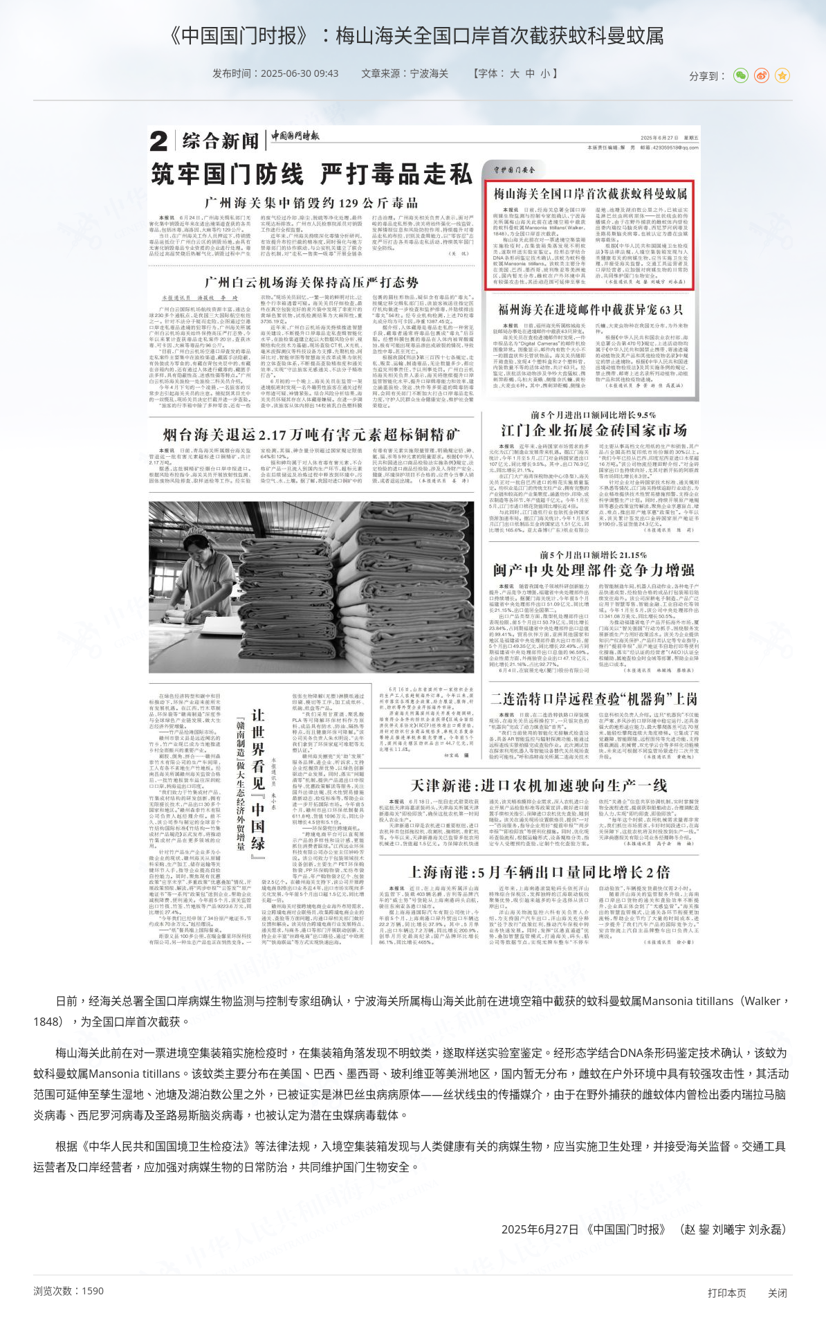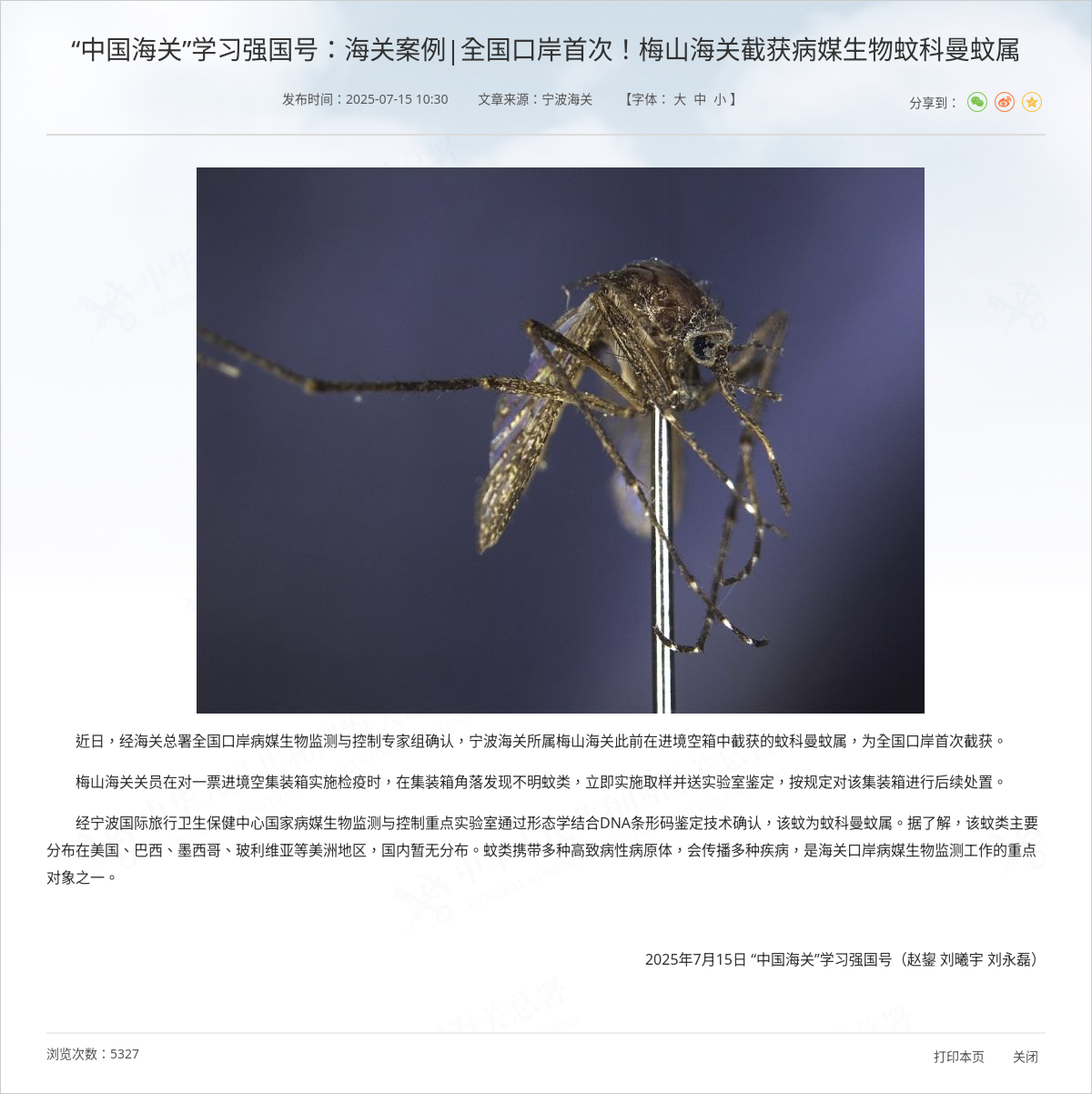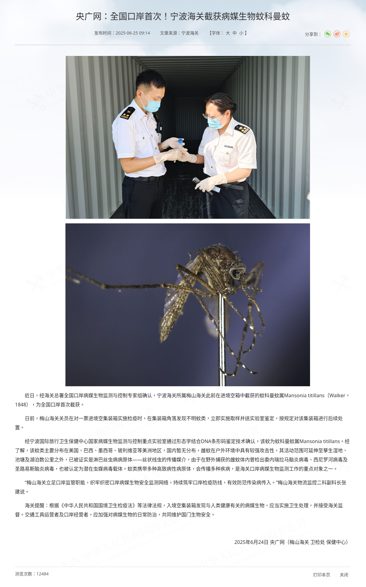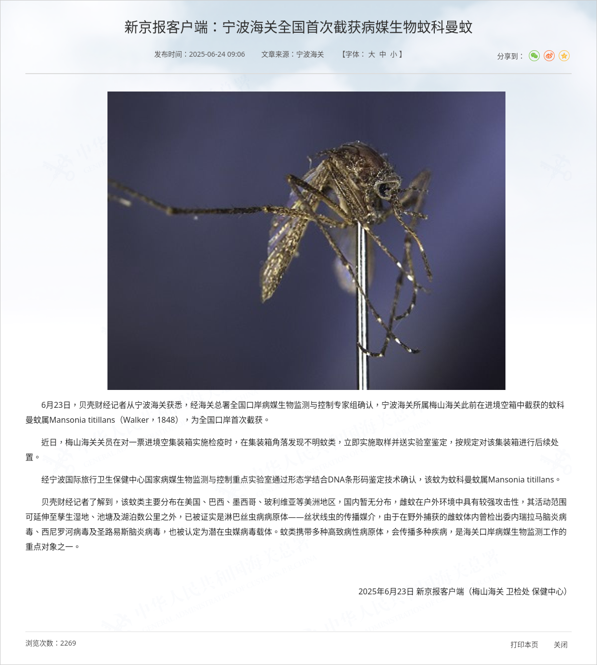 該篇於2025年6月24日發佈的報導提到,寧波梅山海關關員在一個入境空貨櫃發現不明蚊類,經鑑定後確認為蚊科曼蚊屬(Mansonia titillans)。報導提到該蚊類主要分佈在美國、巴西、墨西哥、玻利維亞等美洲地區,在中國內暫無分佈。報導又指「由於在野外捕獲的雌蚊體內曾檢出委內瑞拉馬腦炎、西尼羅河病毒和聖路易斯腦炎,也被認定為潛在蟲媒病毒截體」。[13]