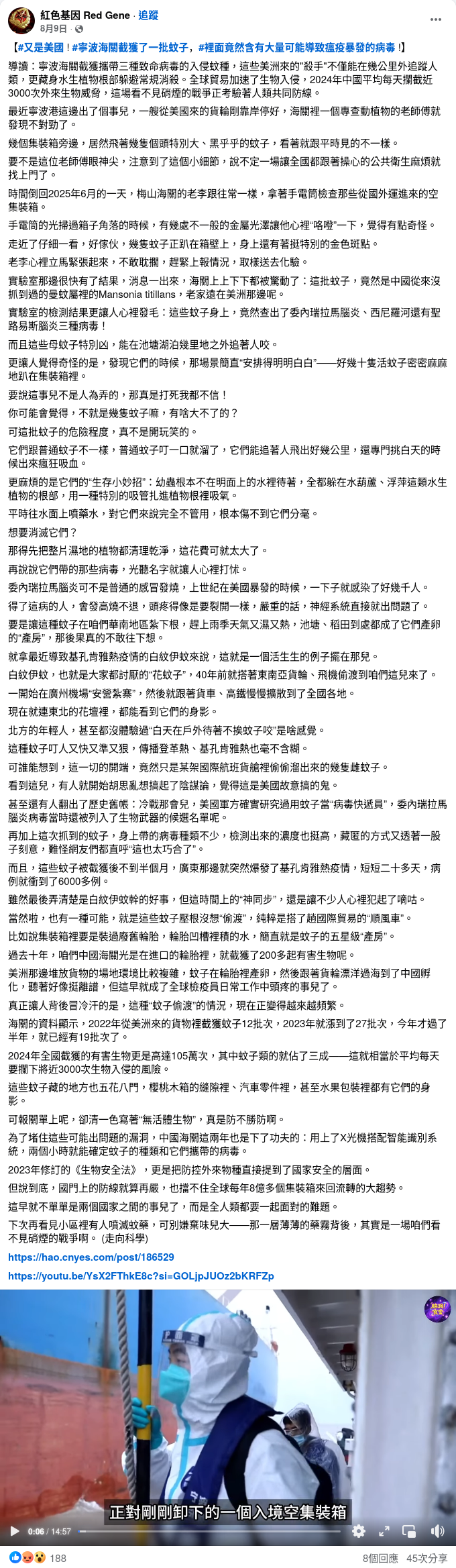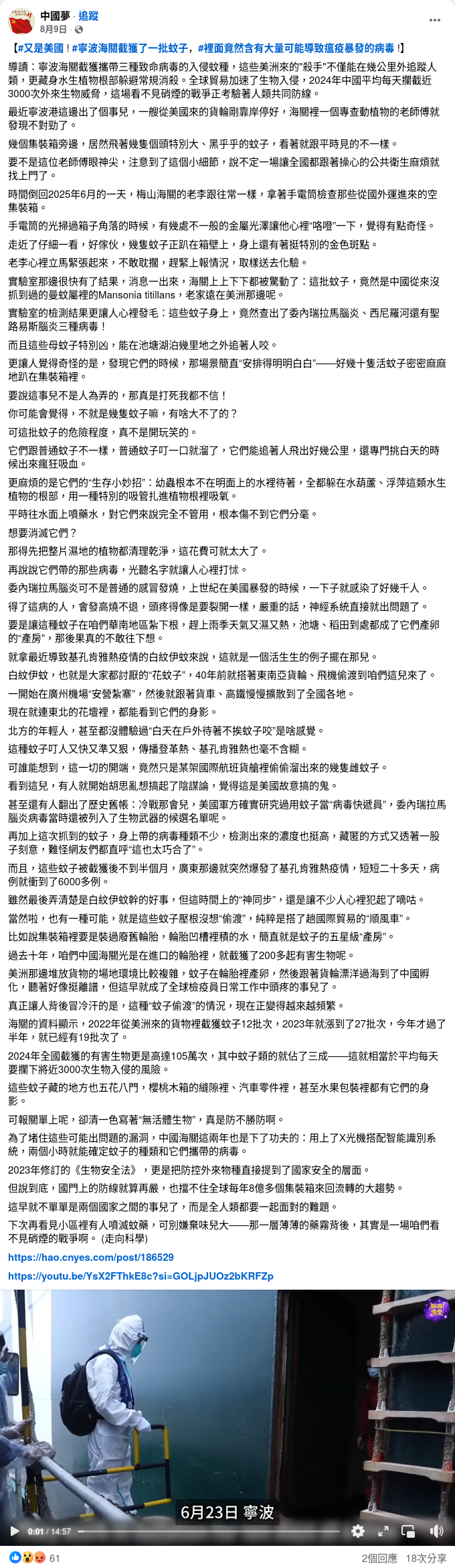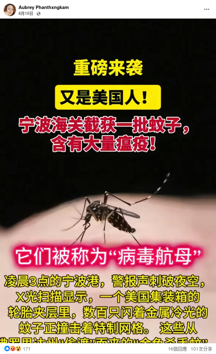 2025年8月10日,Facebook用戶「Aubrey Phanthxngkam」發佈一張圖片,圖中文字宣稱寧波海關截獲一批數百隻「含有大量瘟疫」的蚊子,並宣稱這些數子來自美國佛羅里達州(Florida)以及「飢餓到追着檢疫員撕咬」。帖文獲得171個表情反應、16個留言及101次分享。[1]