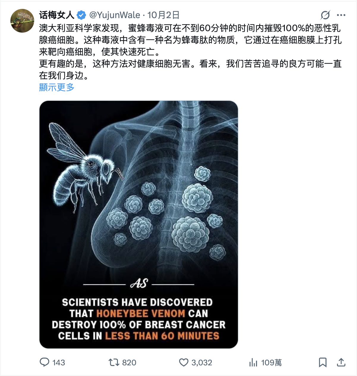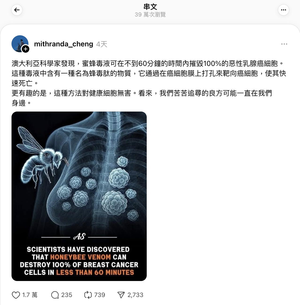 2025年10月3日,Threads用戶「mithranda_cheng」發佈帖文,宣稱有澳洲科學家發現蜜蜂毒液「可在不到60分鐘的時間內摧毀100%的惡性乳腺癌細胞」,並且對健康細胞無害。該帖文獲得1.7萬個讚好、235個留言、3472次分享及約39萬次瀏覽。[1]