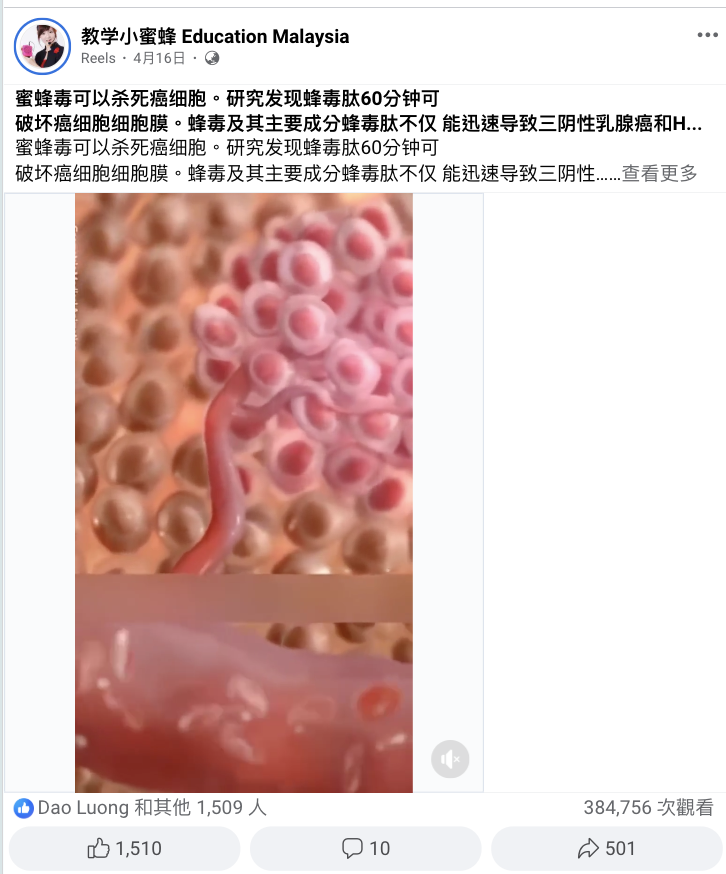 - 社交媒體上流傳帖文宣稱澳洲科學家發現蜜蜂毒液可以快速、完全殺死惡性乳腺癌細胞。