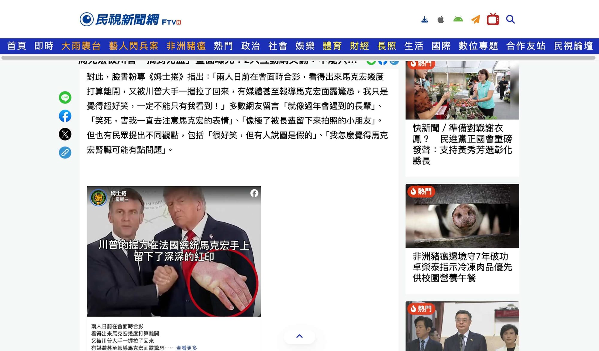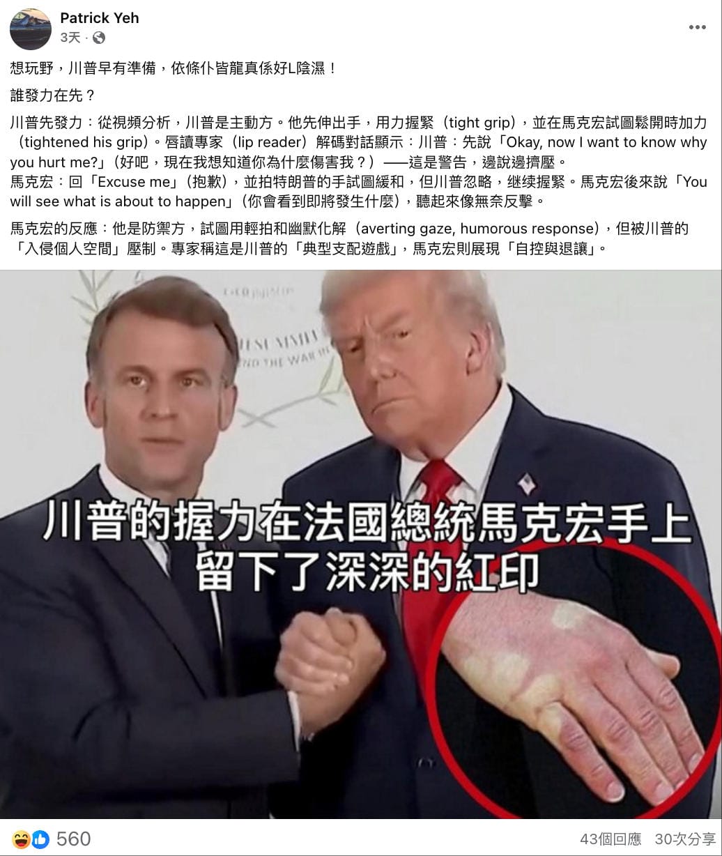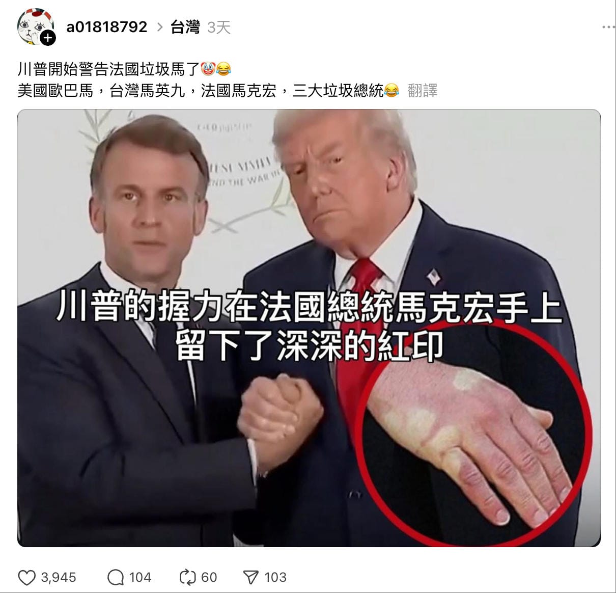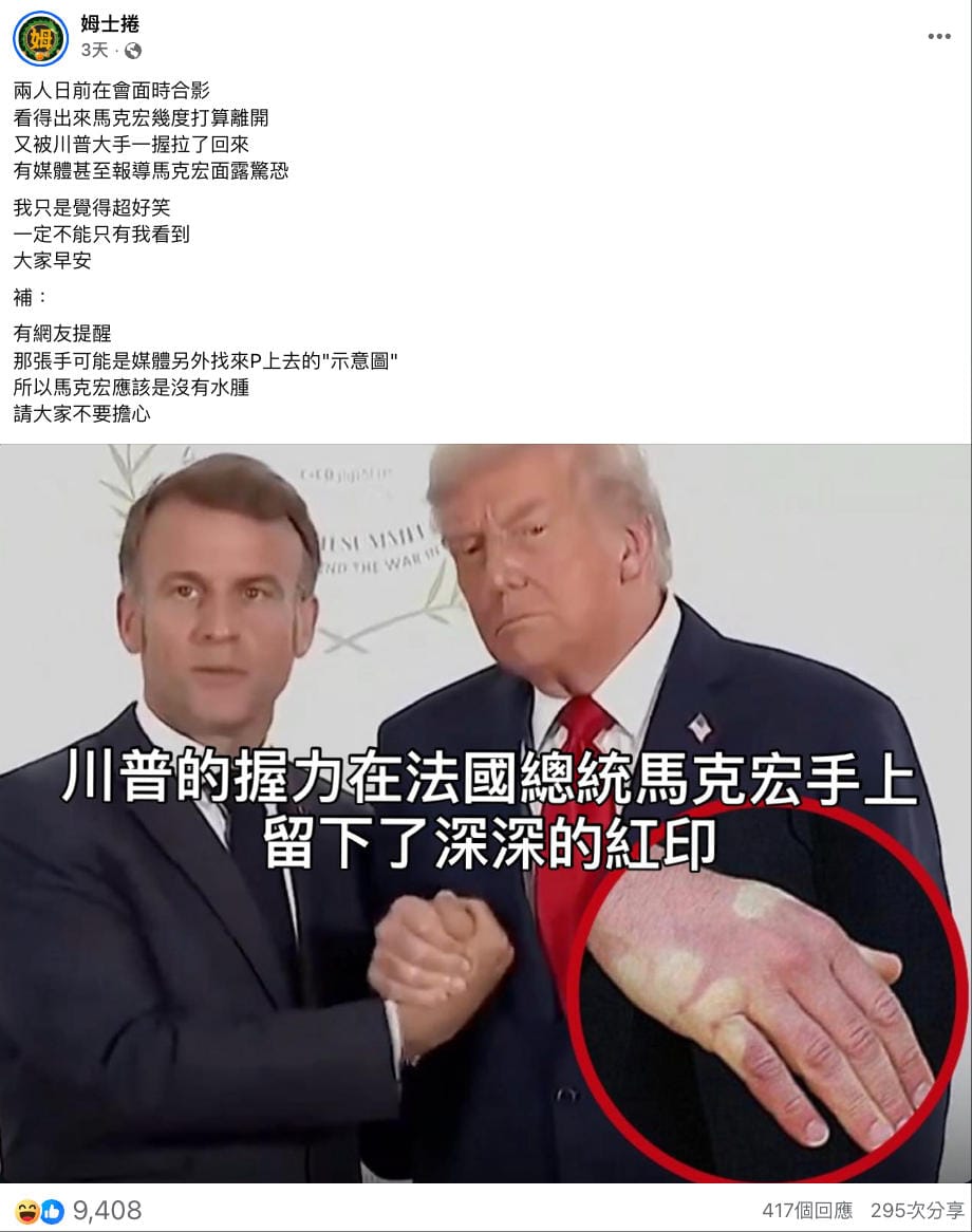 2025年10月16日,Facebook專頁「姆士捲」發佈帖文,並附上美國總統特朗普(Donald Trump)與法國總統馬克龍(Emmanuel Macron)握手的圖片。圖片右下角有一留有紅色印記的手部特寫,中間則加上「川普的握力在法國總統馬克宏手上留下了深深的紅印」一句(「馬克宏」為台灣譯法)。帖文宣稱馬克龍與特朗普會面時多次打算離開,卻被特朗普拉回,最後則補充稱經網友提醒圖片可能經後期修改。台灣《民視新聞網》於報導中引用該帖文。[1,2]Facebook用戶「Patrick Yeh」於同日發佈相同圖片。[3]上述兩則帖文共獲得9,968個表情反應、460個留言及325次分享。