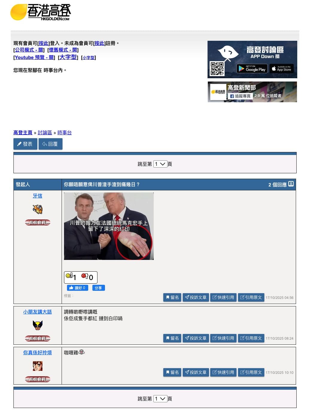 - 你願唔願意俾川普渣手渣到痛幾日?(高登討論區),archive.today備份網頁
