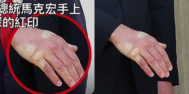 2025年10月,社交媒體流傳一張圖片,宣稱美國總統特朗普與法國總統馬克龍握手後,在後者手上留下紅印,圖中有兩人合照及手部特寫。