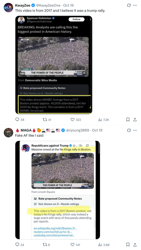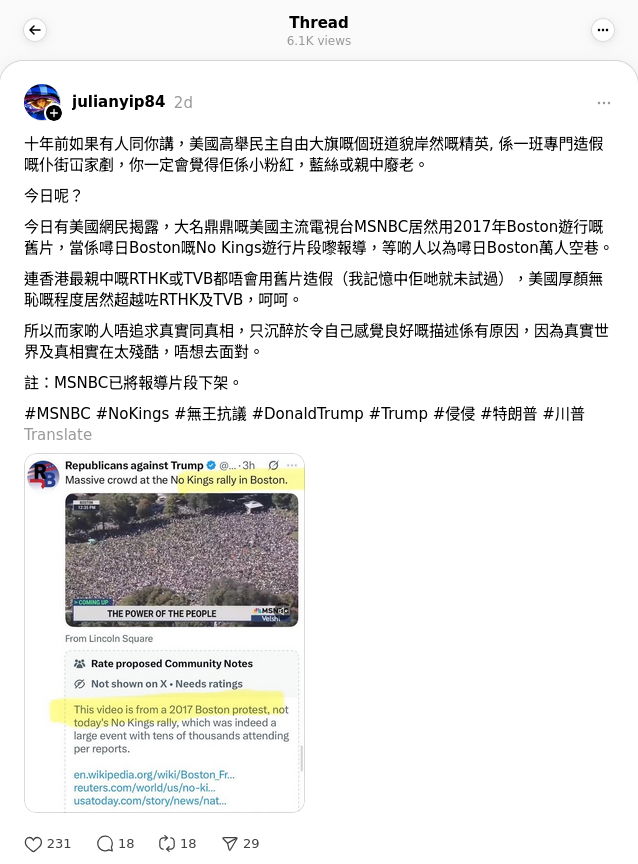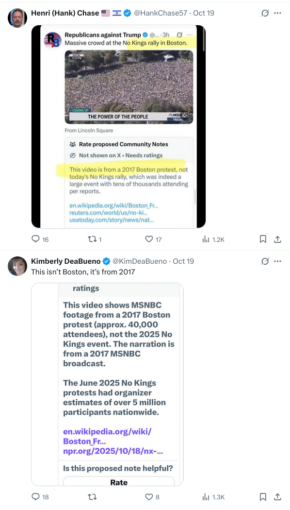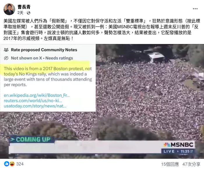 2025年10月19日,Facebook用戶「史健仁」發佈帖文,宣稱美國電視台《MSNBC》報導波士頓的「不要國王」示威時使用2017年舊集會片段,並指《MSNBC》已將有關片段下架。帖文附圖顯示為X(前稱Twitter)用戶「Republicans against Trump」發佈影片截圖,下方顯示一則社群筆記建議(proposed Community Notes)並標明「不會在X顯示」(Not shown on X)及「有待評分」(Needs ratings),該筆記宣稱「這影片來自2017年波士頓示威,並非今天的『不要國王』集會」(This video is from a 2017 Boston protest, not today’s No Kings rally)及附上三條連結,惟圖片未能完整顯示。「史健仁」的帖文獲得153個表情反應、5個留言及34次分享。[3]