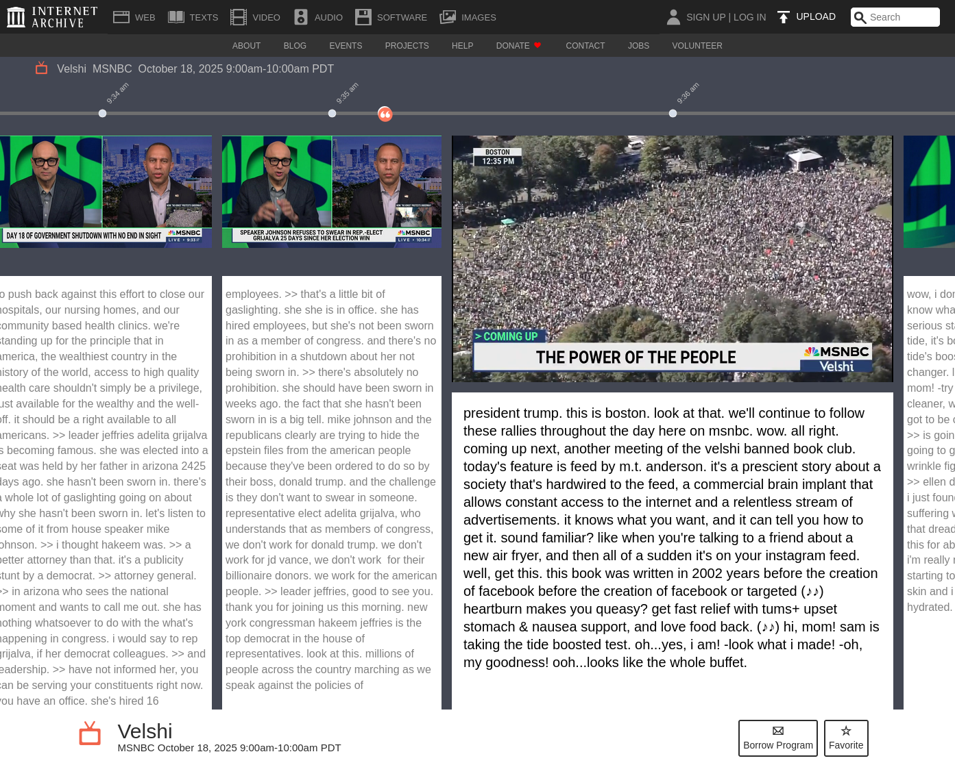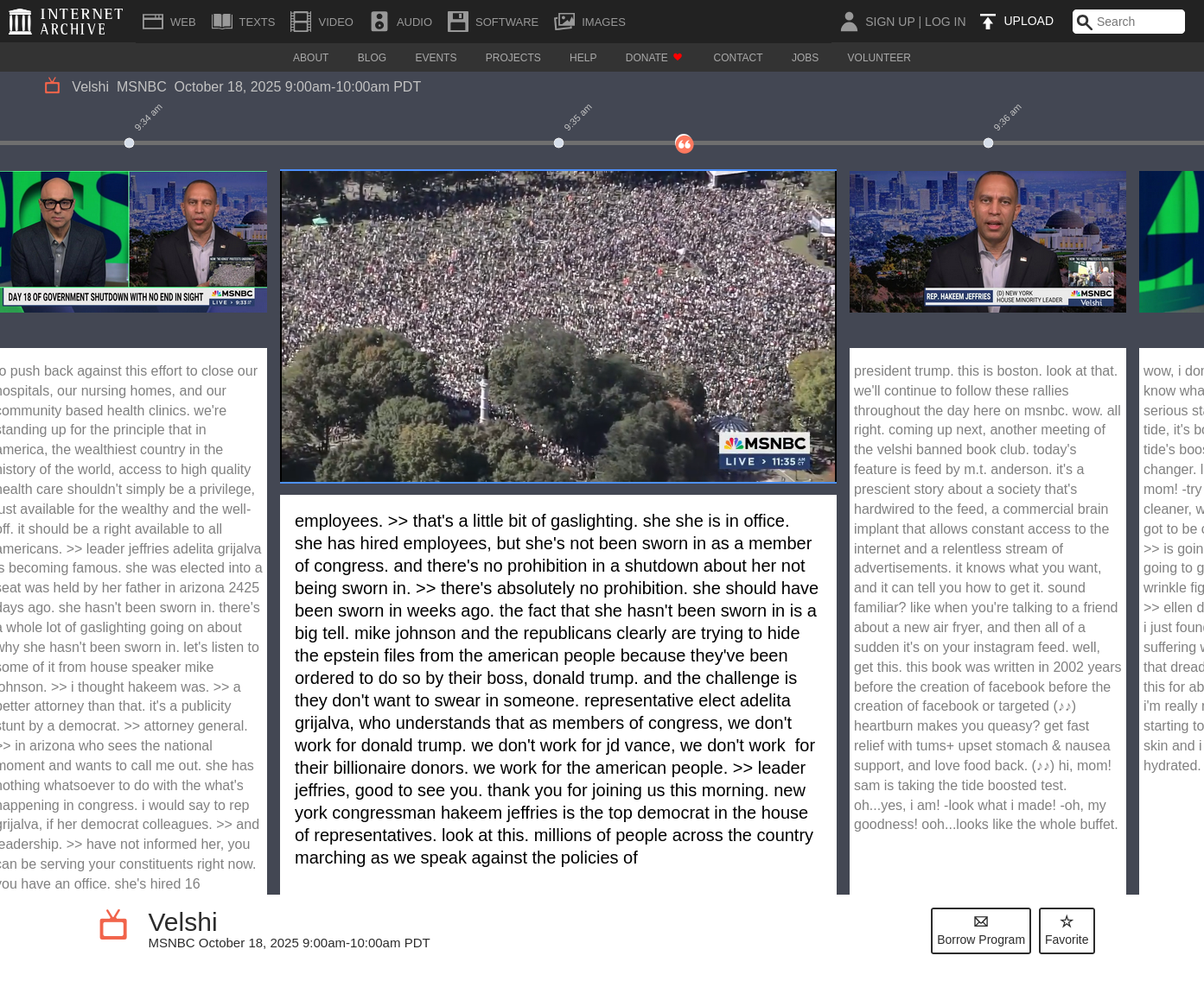 - Velshi: MSNBC October 18, 2025 9:00am-10:00am PDT (Internet Archive),可使用網站時間軸檢視9時35分的片段。