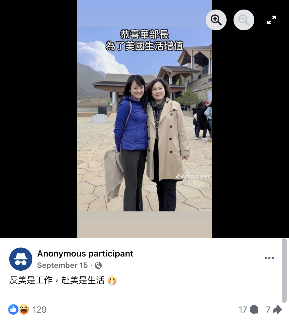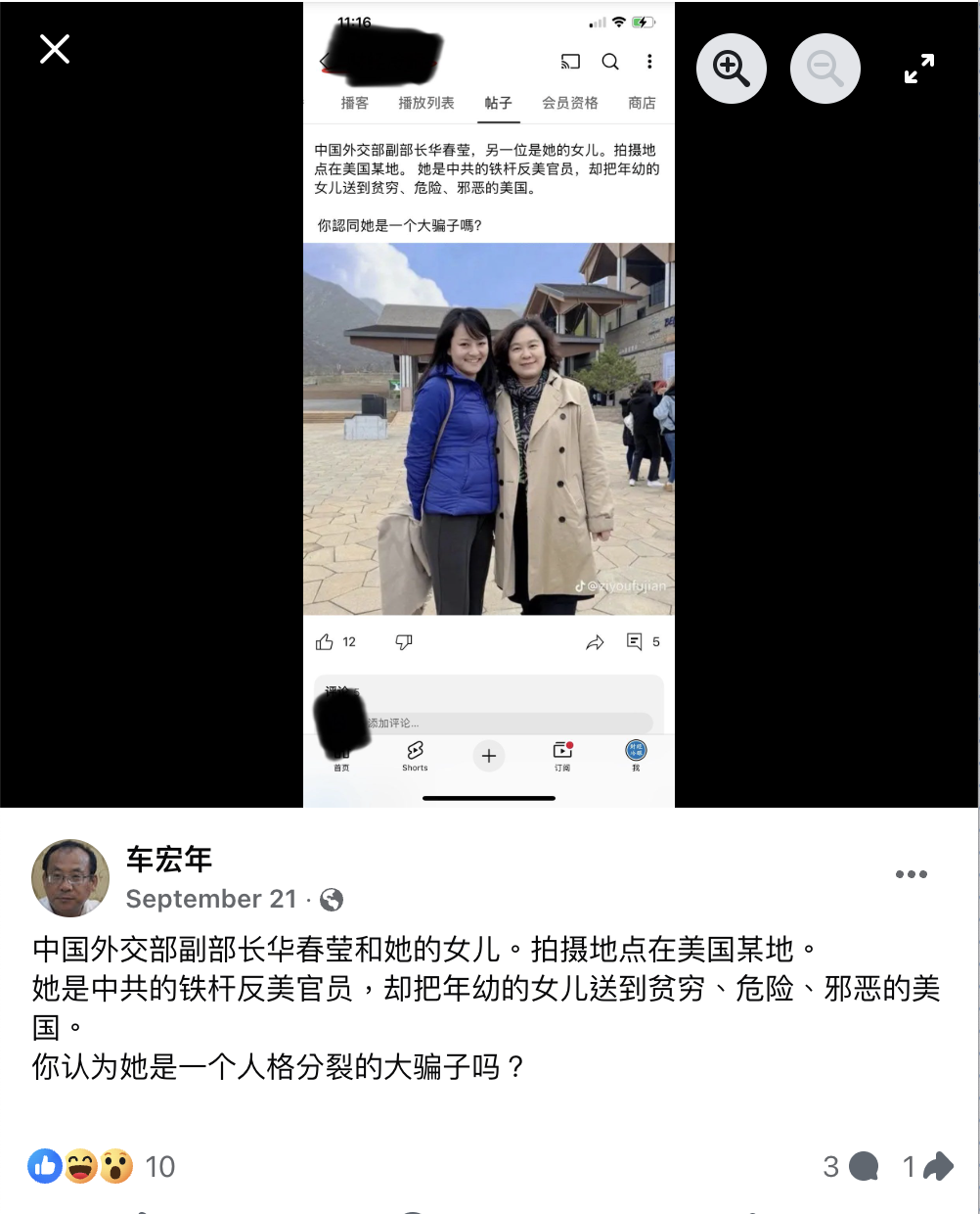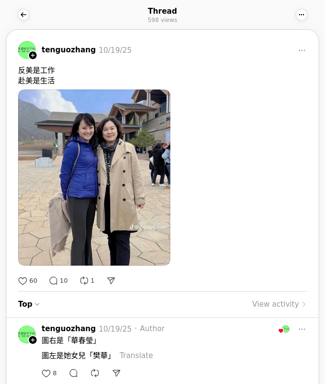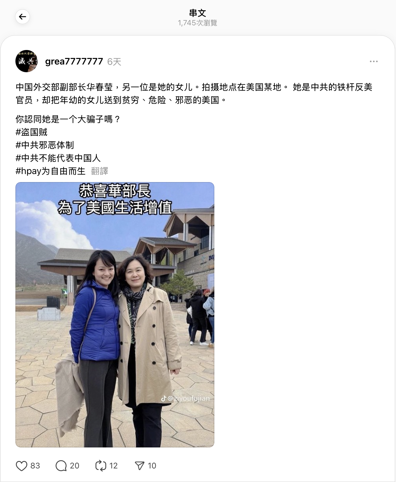 Threads用戶「tenguozhang」發佈帖文「反美是工作 赴美是生活」並分享同一張合照,惟沒有加上文字。該用戶亦回覆宣稱圖中為華春瑩及其女兒。該帖文獲得60個讚好、10個留言及1次轉發及分享,以及593次查看。[2]