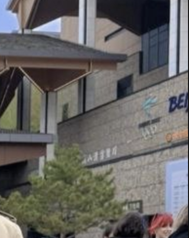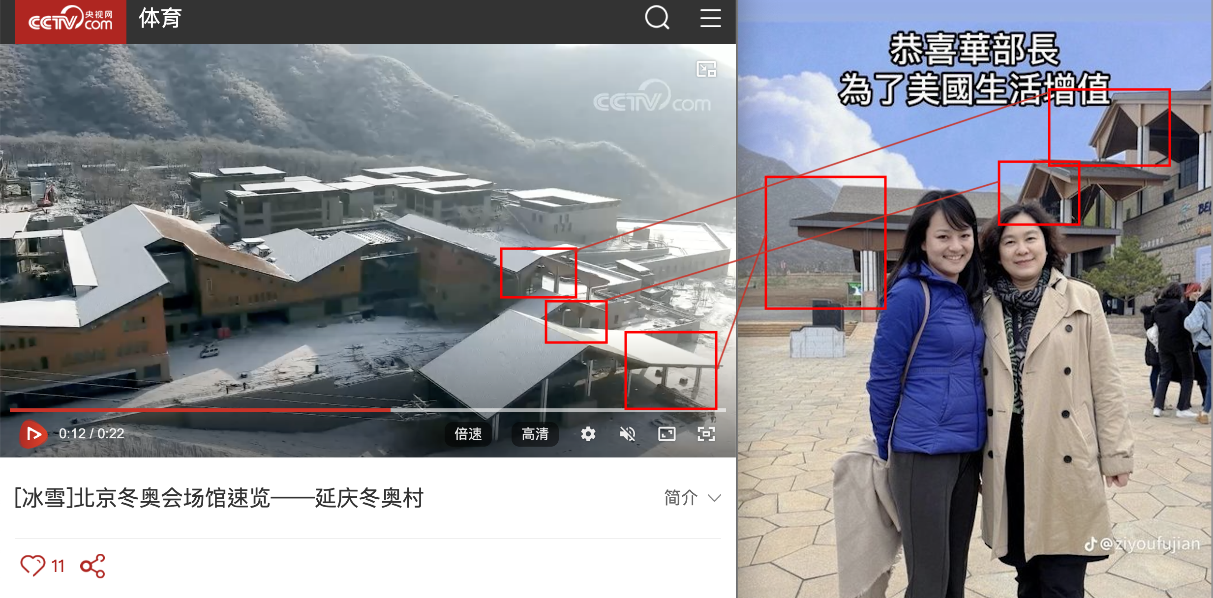 在百度搜尋「2022 北京冬奧會 場館」,可發現《央視網》2022年1月20日發佈的影片。影片第12秒所顯示的延慶冬奧村建築外觀,尤其是房檐及斗拱的設計,與網傳合照中背景中的建築一致(見圖10)。[9]根據百度地圖,延慶冬奧村位於北京市[10],所以合照拍攝地點並非美國。