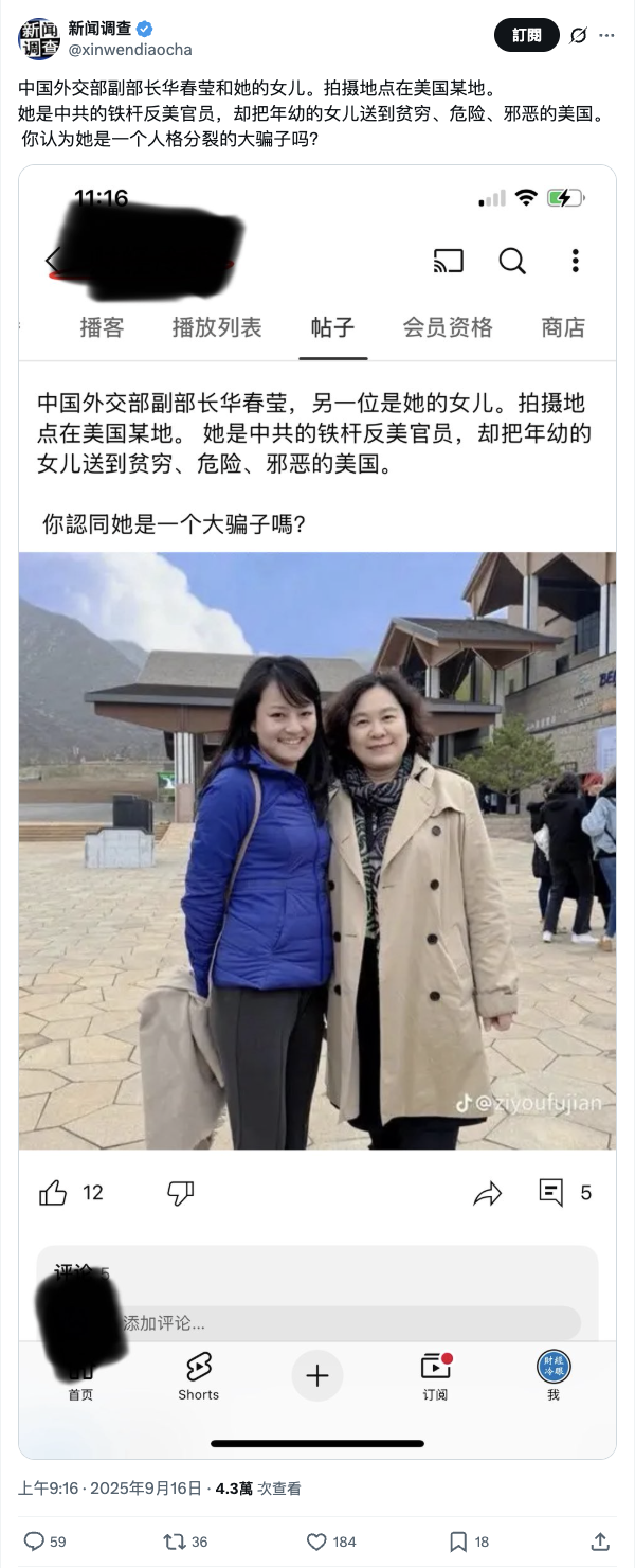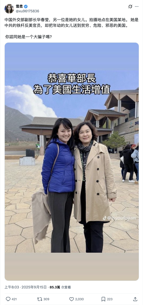 - 社交媒體流傳一張中國外交部副部長華春瑩的合照,被指為她與其女兒在美國拍攝。