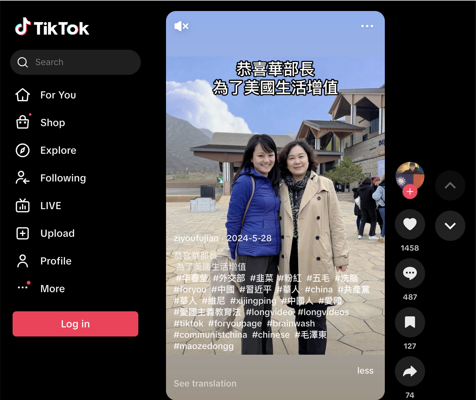 上述所有帖文的附圖右下方都有顯示TikTok標誌及「@ziyoufujian」的浮水印。在TikTok搜尋「@ziyoufujian」可找到同名用戶。在該用戶主頁的右上角選擇「最舊」,將影片根據發佈時間從舊到新排序,逐條檢視影片內容,可找到該用戶在2024年5月28日發佈網傳合照。影片簡介及影片中均有「恭喜華部長 為了美國生活增值」一句,並未提及與華春瑩合照女子是其女兒,亦沒有提到照片拍攝於美國。另外,該TikTok短片並未提及合照出處。[8]