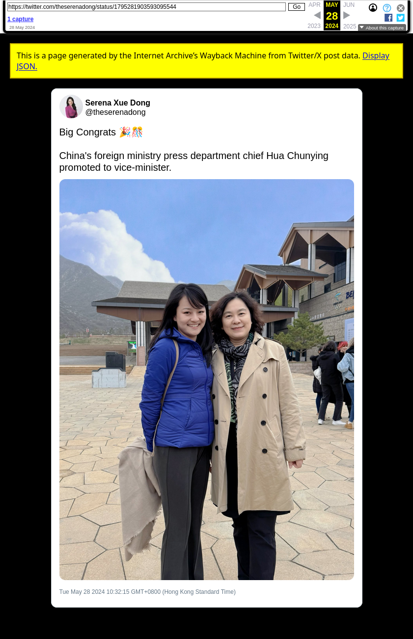 - 見[11]中第二張附圖。圖中從上往下第一個搜尋結果中顯示短網址「https://t.co/262B4TrY5F」。將該連結在瀏覽器中打開,可獲得完整的X帖文連結「https://x.com/theserenadong/status/1795281903593095544」。在「網站時光機」(Wayback Machine) 中輸入此連結,即可找到董雪帖文的備份網頁。