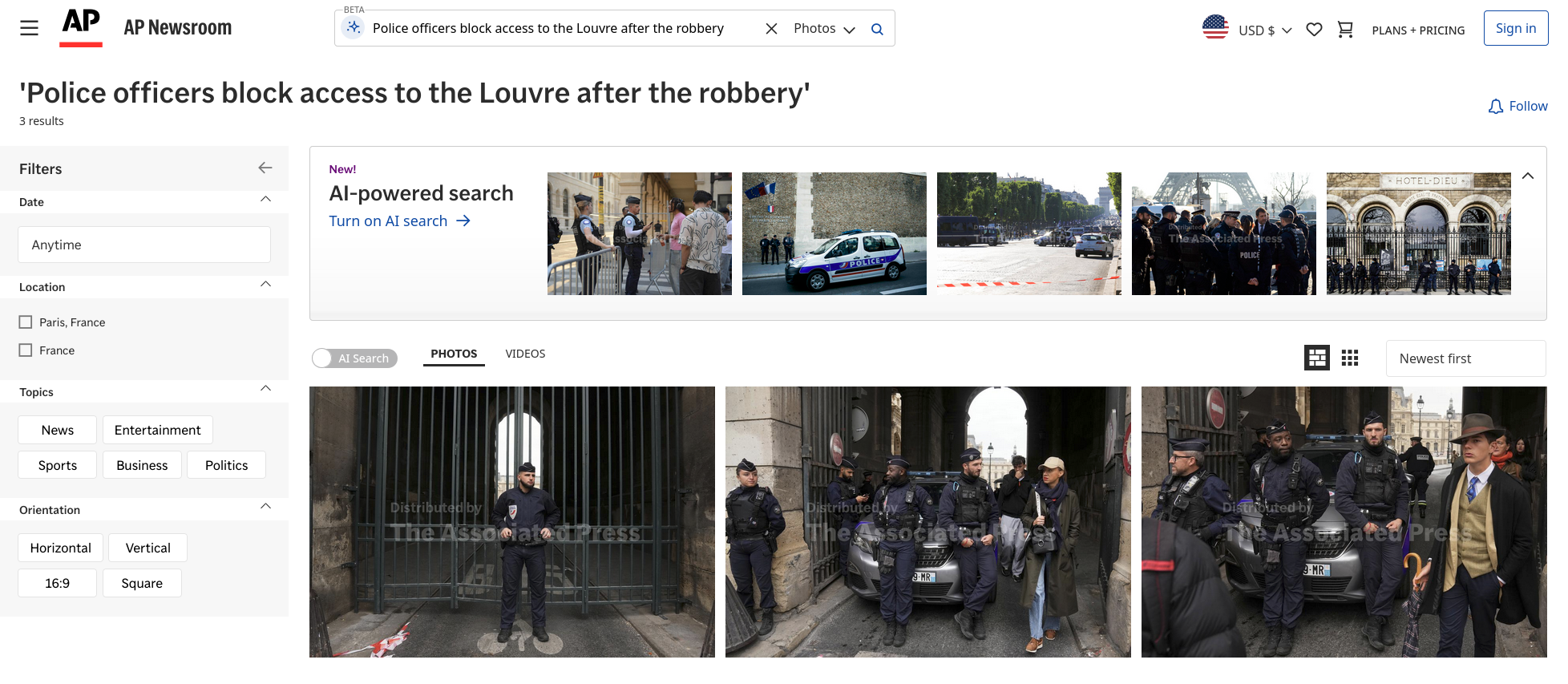 - 在AP Newsroom搜尋「Police officers Louvre」並把日期限制在2025年10月18日至22日