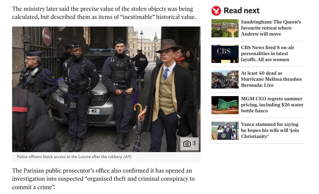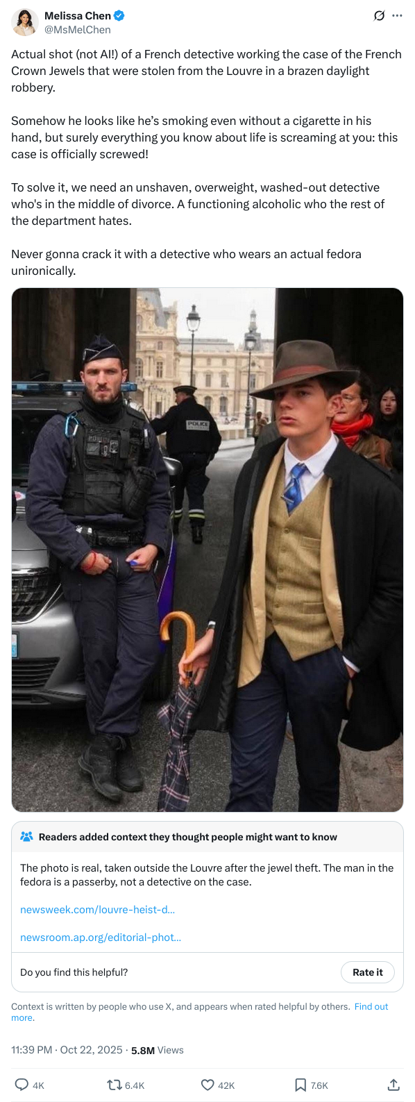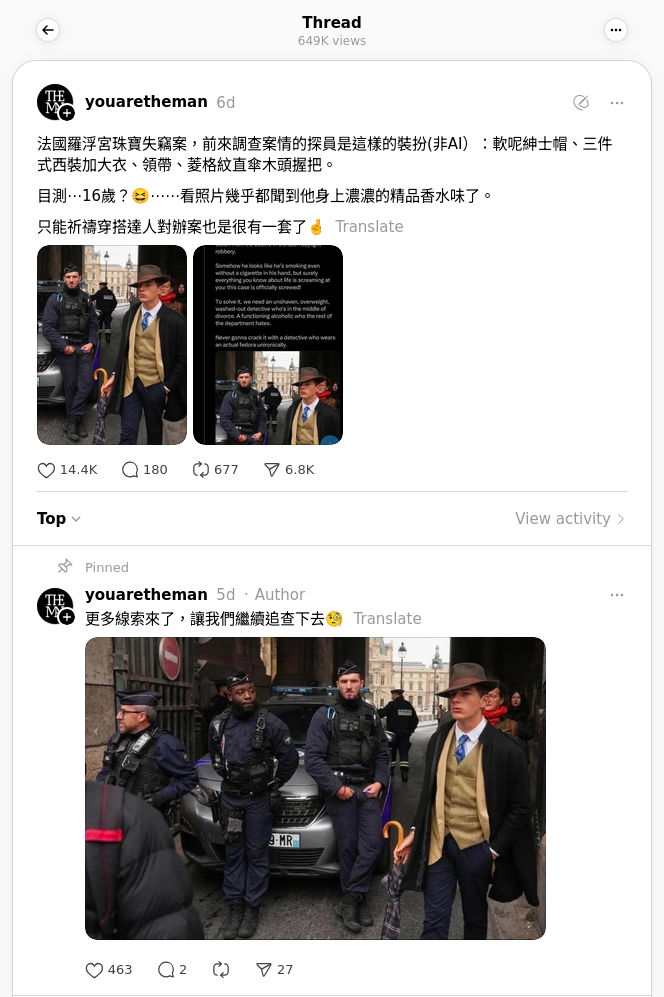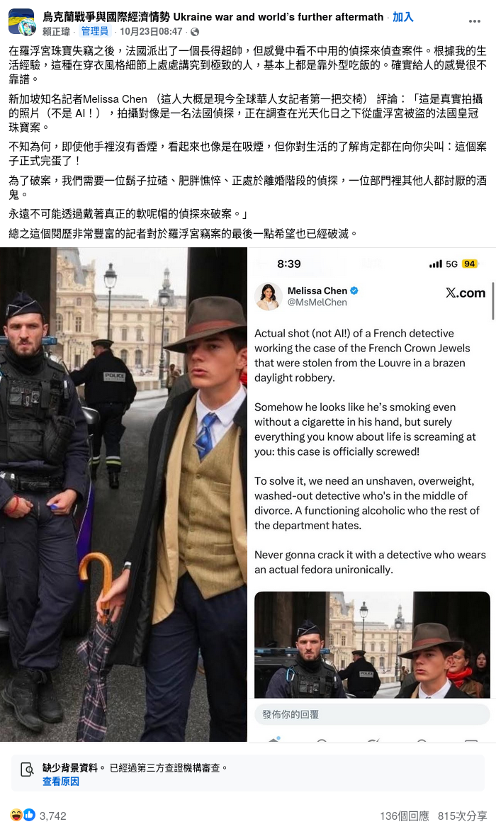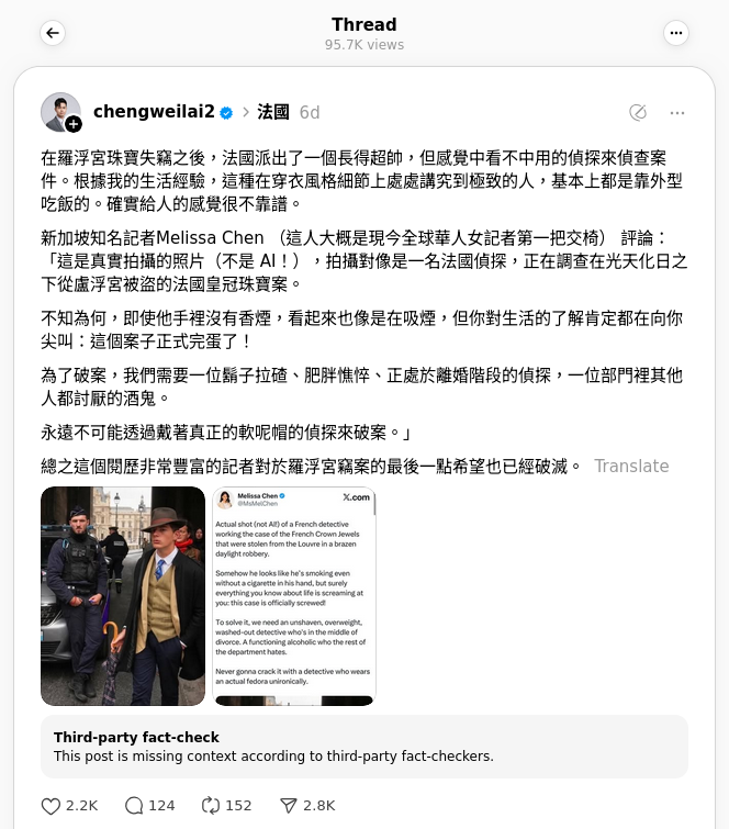 2025年10月23日,Threads用戶「Cheng-Wei Lai」發佈帖文,宣稱「在羅浮宮珠寶失竊之後,法國派出了一個長得超帥,但感覺中看不中用的偵探來偵查案件」。帖文附上羅浮宮外的照片,照片左方可見有警員站在警車前,右方則有一位穿上西裝及大褸、持傘、戴帽的男子單手插袋,該男子為帖文所指的「偵探」。帖文亦附上一則X(前稱Twitter)用戶「Melissa Chen」的帖文截圖作為消息來源,並稱該用戶為「新加坡知名記者」及「大概是現今全球華人女記者第一把交椅」,帖文最後指「這個閱歷非常豐富的記者對於羅浮宮竊案的最後一點希望也已經破滅」。[1]