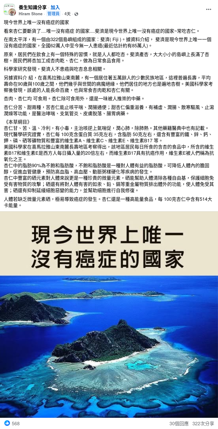 2025年10月31日,Facebook用戶「Hiram Stone」於群組「養生知識分享」發文,宣稱「斐濟是現今世界上唯一沒有癌症的國家」並指「科學家研究發現,斐濟人不患癌與吃杏息息相關」。帖文獲得568次讚好、30個留言及322次分享。[1]
