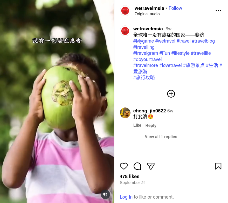 Instagram用戶「WeTravel」及Facebook用戶「黃群耀」分別於2025年9月及10月發佈影片,兩段影片同樣宣稱「斐濟是世上唯一沒有癌症病例的國家」,共獲482個讚好。[2,3]