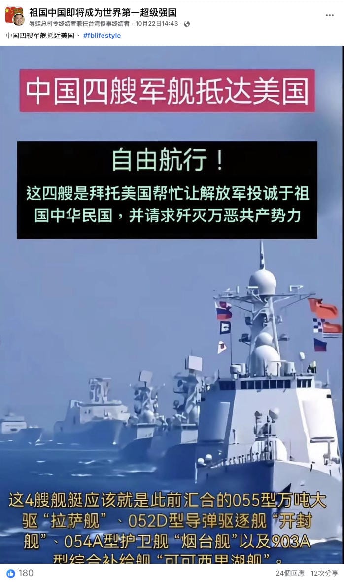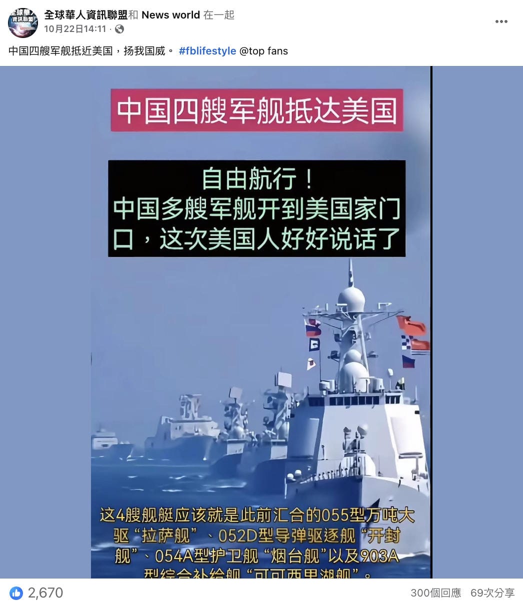 2025年10月22日,Facebook專頁「全球華人資訊聯盟」發佈一張若干軍艦在海上行駛的圖片,聲稱「中国四艘军舰抵近美国,扬我国威」。圖中文字稱四艘艦艇名為拉薩艦、開封艦、煙台艦和可可西里湖艦。[1]