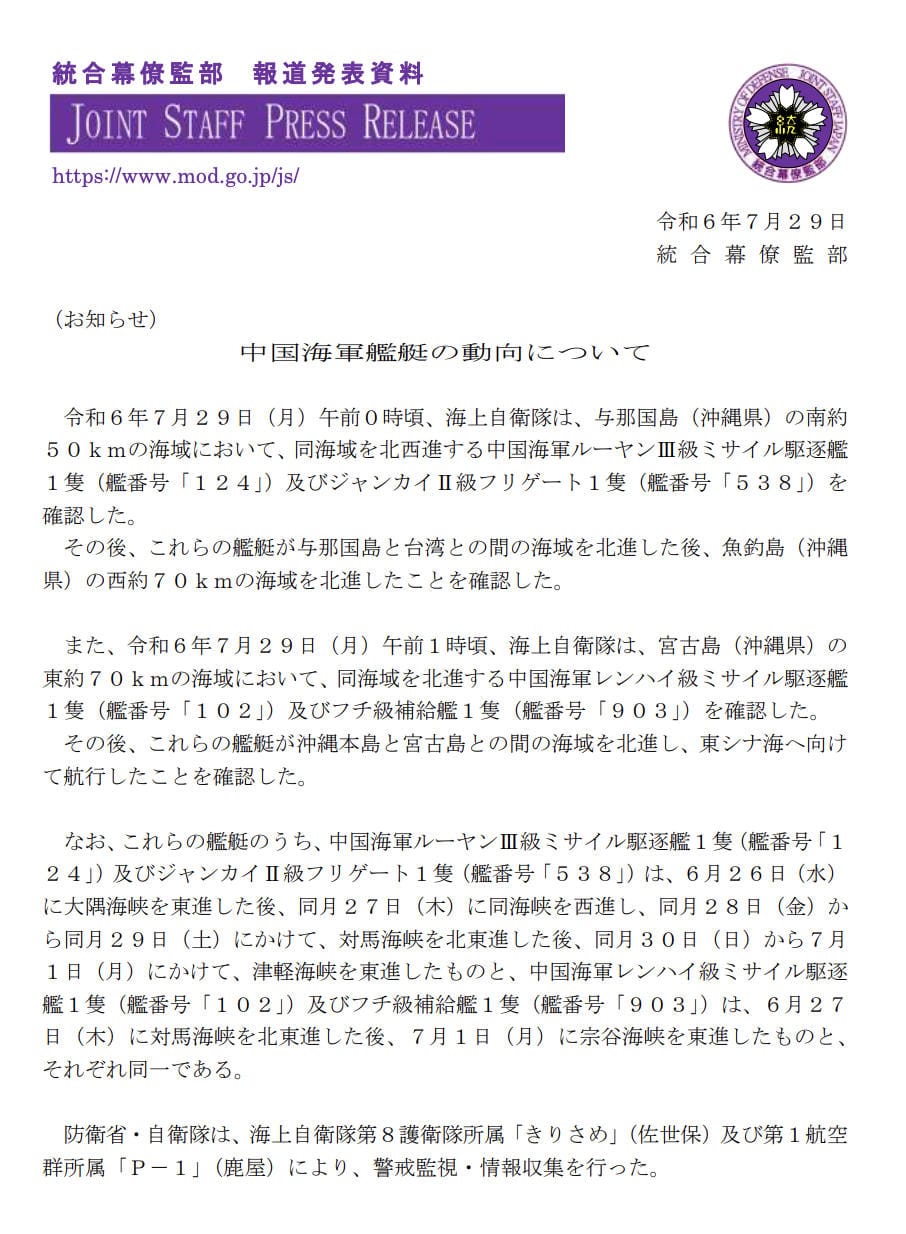 - 中国海軍艦艇の動向について(防衛省統合幕僚監部),Wayback Machine備份網頁。原文為“令和6年7月29日(月)午前0時頃、海上自衛隊は、与那国島(沖縄県)の南約50kmの海域において、同海域を北西進する中国海軍ルーヤンⅢ級ミサイル駆逐艦1隻(艦番号「124」)及びジャンカイⅡ級フリゲート1隻(艦番号「538」)を確認した。その後、これらの艦艇が与那国島と台湾との間の海域を北進した後、魚釣島(沖縄県)の西約70kmの海域を北進したことを確認した。また、令和6年7月29日(月)午前1時頃、海上自衛隊は、宮古島(沖縄県)の東約70kmの海域において、同海域を北進する中国海軍レンハイ級ミサイル駆逐艦1隻(艦番号「102」)及びフチ級補給艦1隻(艦番号「903」)を確認した。”