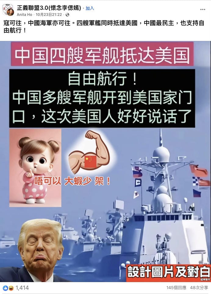 10月23日,Facebook用戶「Anita Ho」於群組「正義聯盟3.0(懷念李偲嫣) 」發佈相似圖片,圖中加上卡通圖案、紅字「唔可以 大蝦少 架!」和美國總統特朗普(Donald Trump)的頭像,右下角則標註「設計圖片及對白」。[2]另一版本的圖片在群組「祖国中国即将成为世界第一超级强国」亦有傳播,但圖中文字顯示四艘艦艇抵美是為了向中華民國投誠,請求美國殲滅共產勢力。[3]以上三則帖文共獲得4,264個表情反應、469個留言及129次分享。