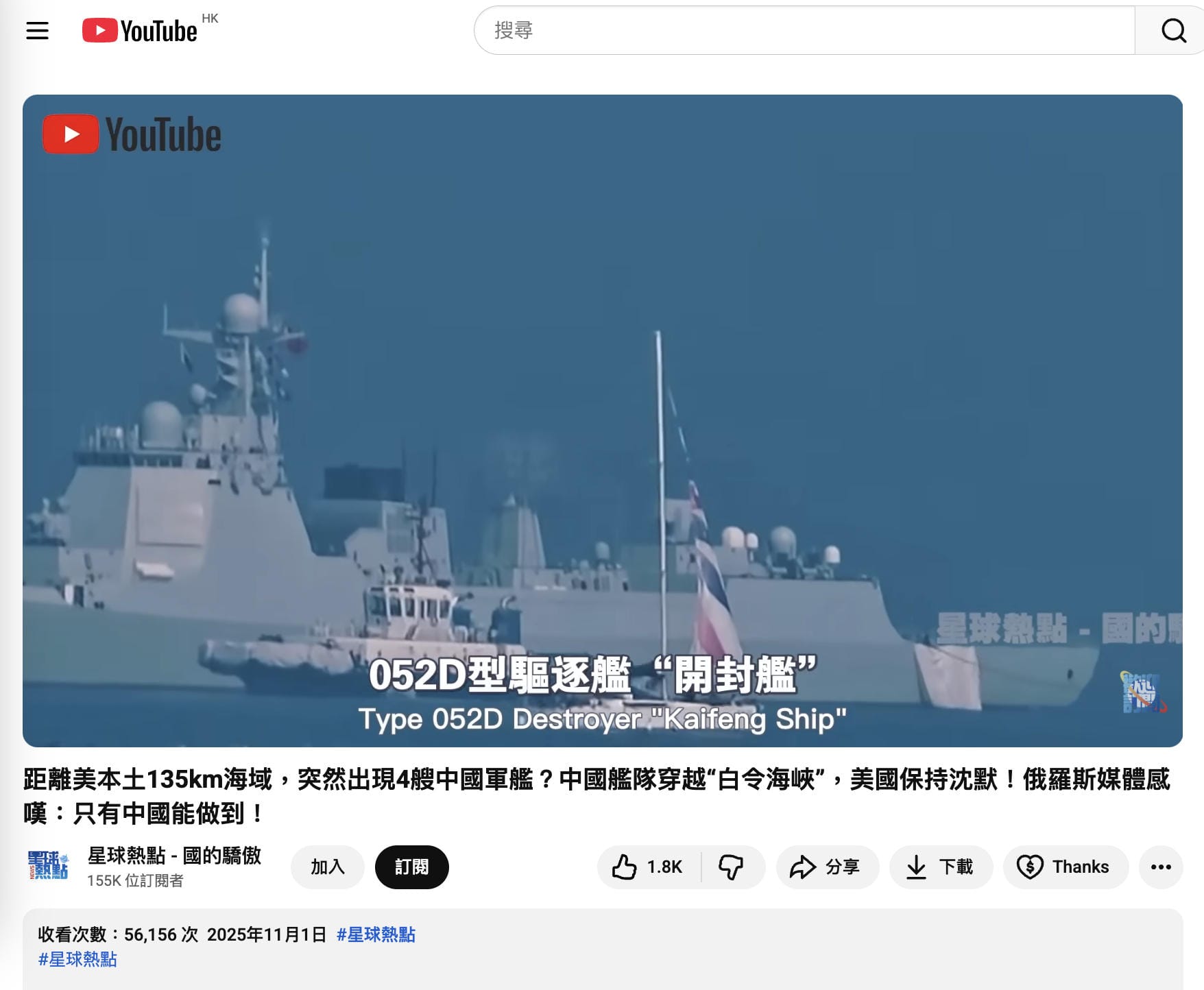 YouTube頻道「星球熱點 - 國的驕傲」於2025年11月1日發佈相似說法的影片,片段獲56,156次觀看和126則評論。[4]