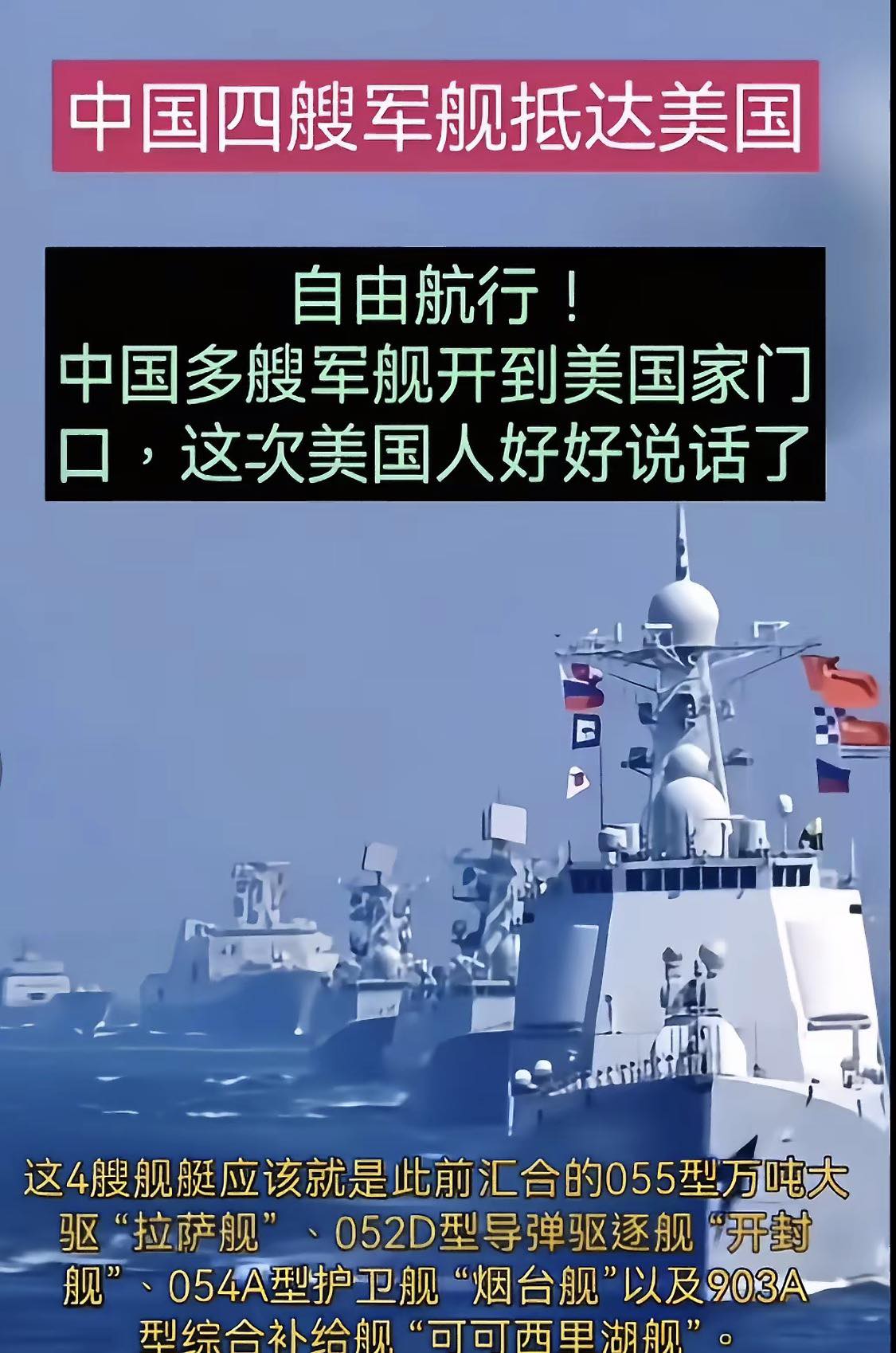 2025年10月,社交媒體流傳一張若干軍艦在海上行駛的圖片,宣稱中國四艘軍艦拉薩艦、開封艦、煙台艦和可可西里湖艦抵達美國。