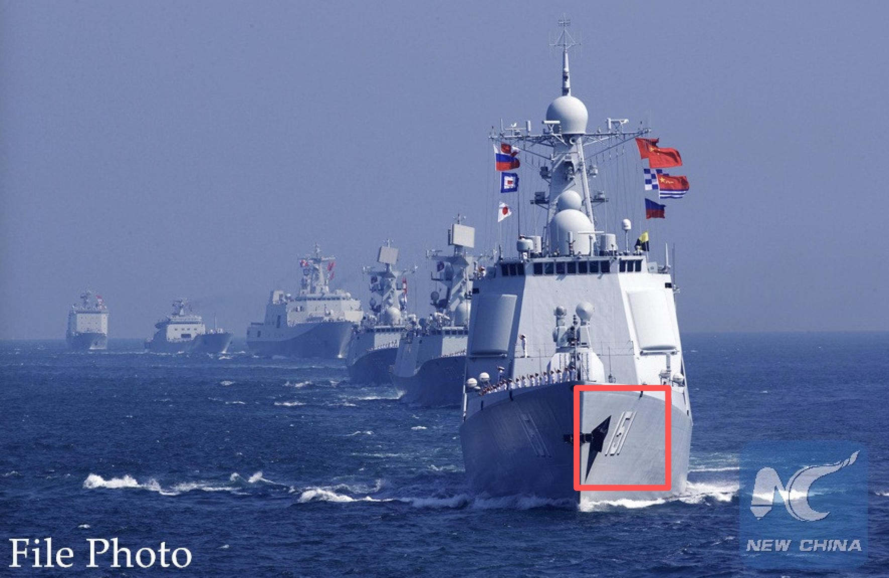 - Alamy照片,archive.today備份網頁。照片文字簡介原文為“19th Sep, 2016. Chinese officers and soldiers waves to say goodbye to Russian fleet during a China-Russia naval joint drill at sea off south China's Guangdong Province, Sept. 19, 2016. The closing ceremony of the "Joint Sea 2016" drill was held at the joint director department after Chinese and Russian fleets completed all scheduled subjects of the drill on a sea area east of Zhanjiang in south China's Guangdong Province on Monday. Credit: Zha Chunming/Xinhua/Alamy Live News”