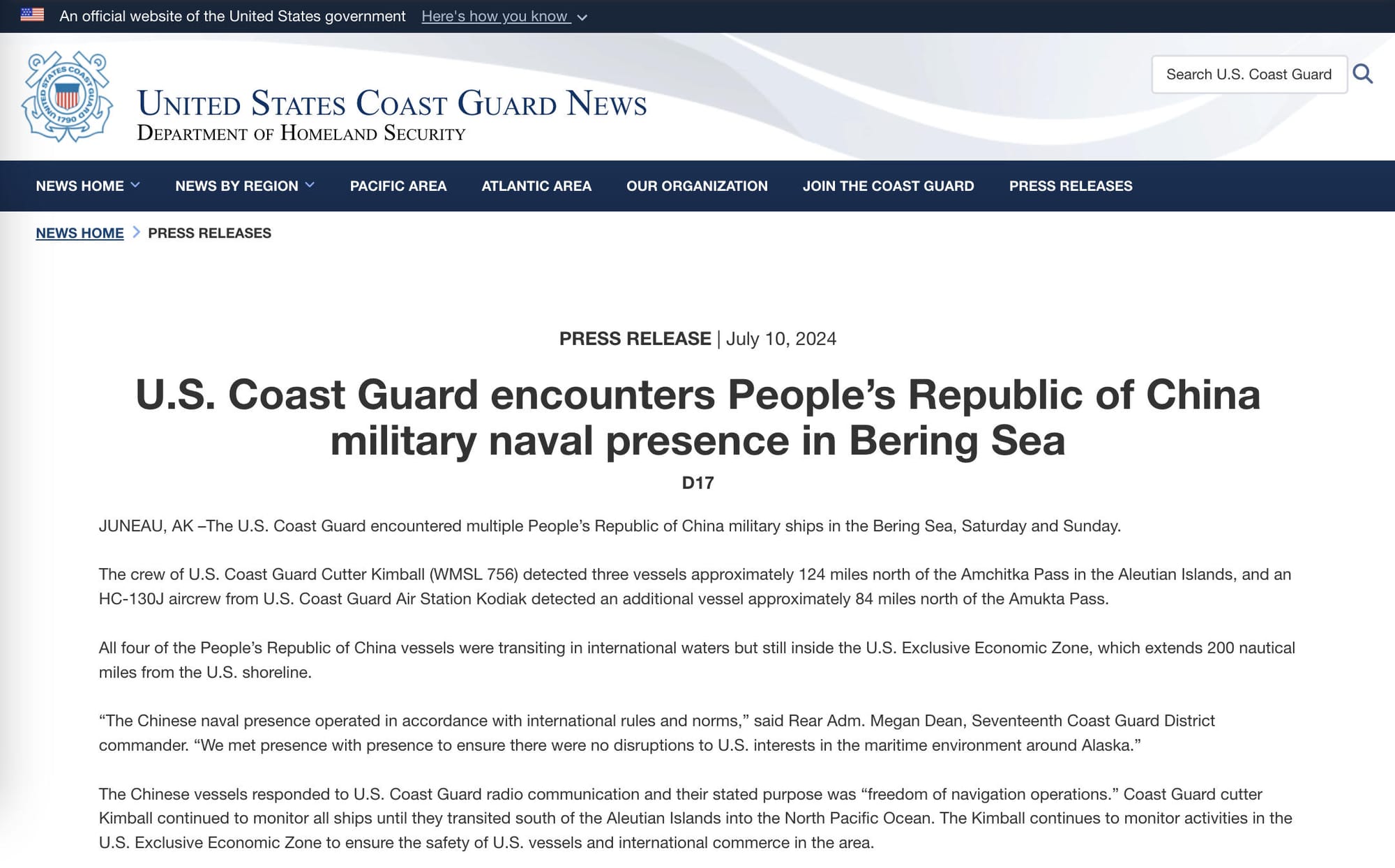 在Google搜尋關鍵詞「US Four Chinese military vessels」,可發現美國海岸警衛隊新聞網(U.S. Coast Guard News)於2024年7月10日發佈的新聞稿顯示,美國海岸警衛隊2024年7月於阿拉斯加白令海(Bering Sea)巡邏時,在阿留申群島(Aleutian Islands)和阿穆克塔海峽(Amukta Pass)附近發現四艘中國軍艦,四艘艦艇都在國際水域過境,但仍在美國專屬經濟區內。惟全文並未公布軍艦的具體名稱。[12]