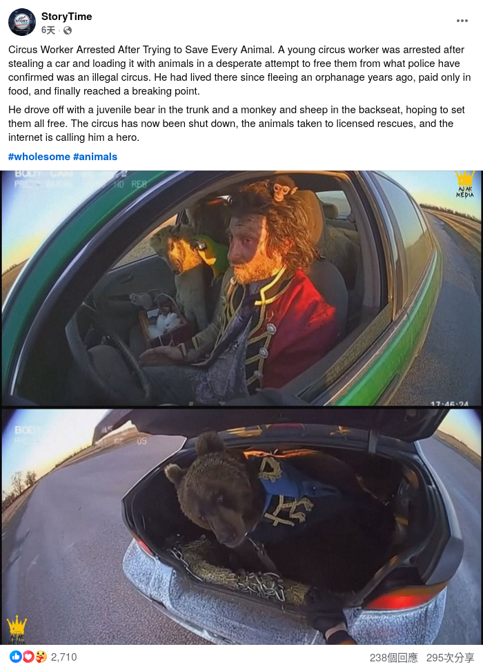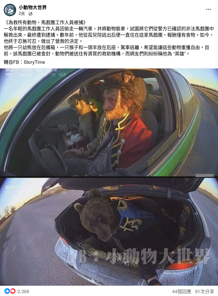 Facebook專頁「小動物大世界」發佈帖文,宣稱有非法馬戲團的工作人員為救走動物而偷車,最終被捕。