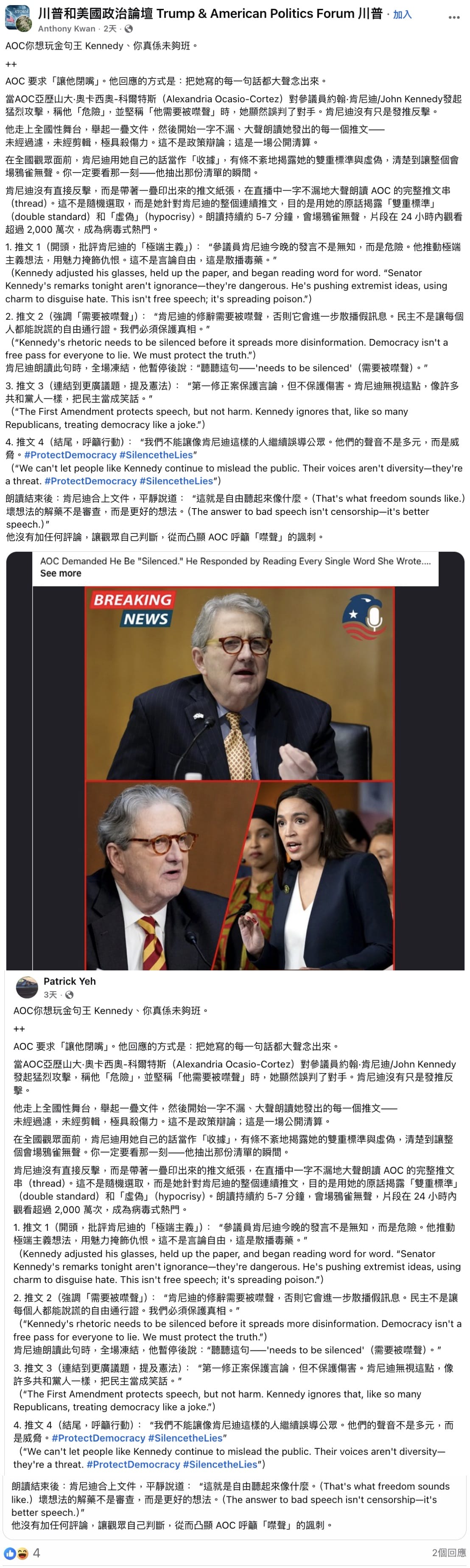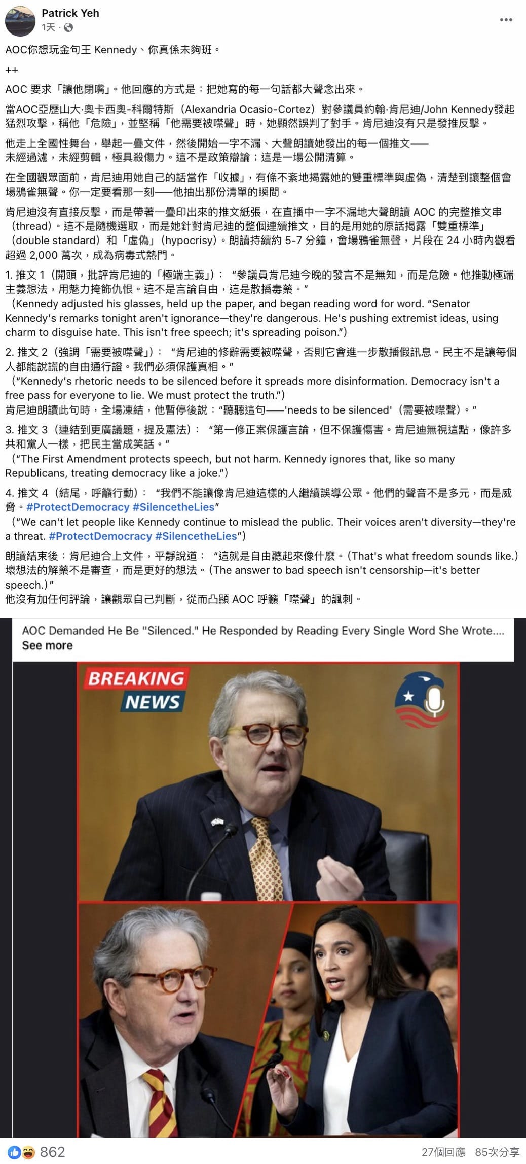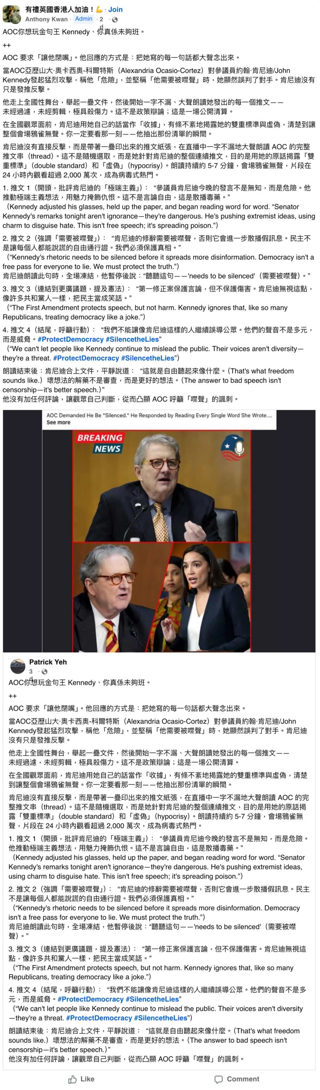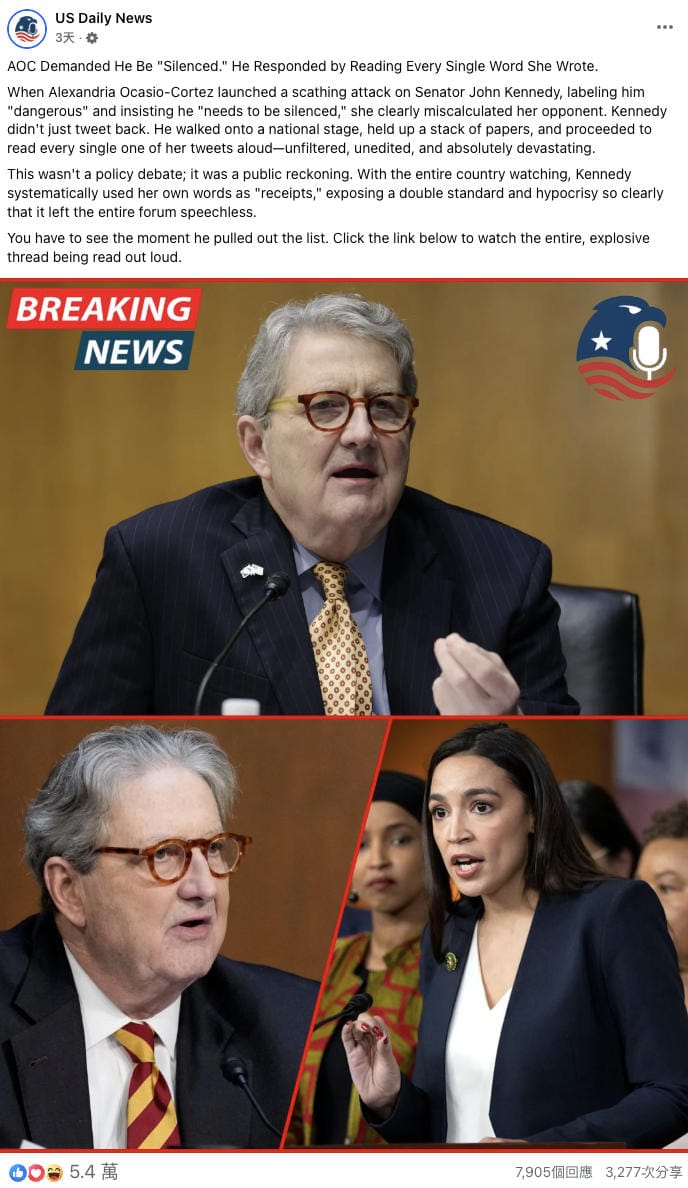 2025年11月12日,Facebook用戶「Patrick Yeh」發佈一張美國眾議員奧卡西奧·科爾特斯(Alexandria Ocasio-Cortez,簡稱為AOC)和參議員約翰·甘迺迪(John Kennedy)的拼接圖片,並聲稱由於AOC強烈批評甘迺迪,後者在直播中大聲朗讀AOC的社交媒體帖文(文中稱為「推文」)反擊。「Patrick Yeh」的帖文附上宣稱由甘迺迪朗讀的四則帖文內容,並指相關直播片段在24小時內「觀看超過 2,000 萬次,成為病毒式熱門」。[1]