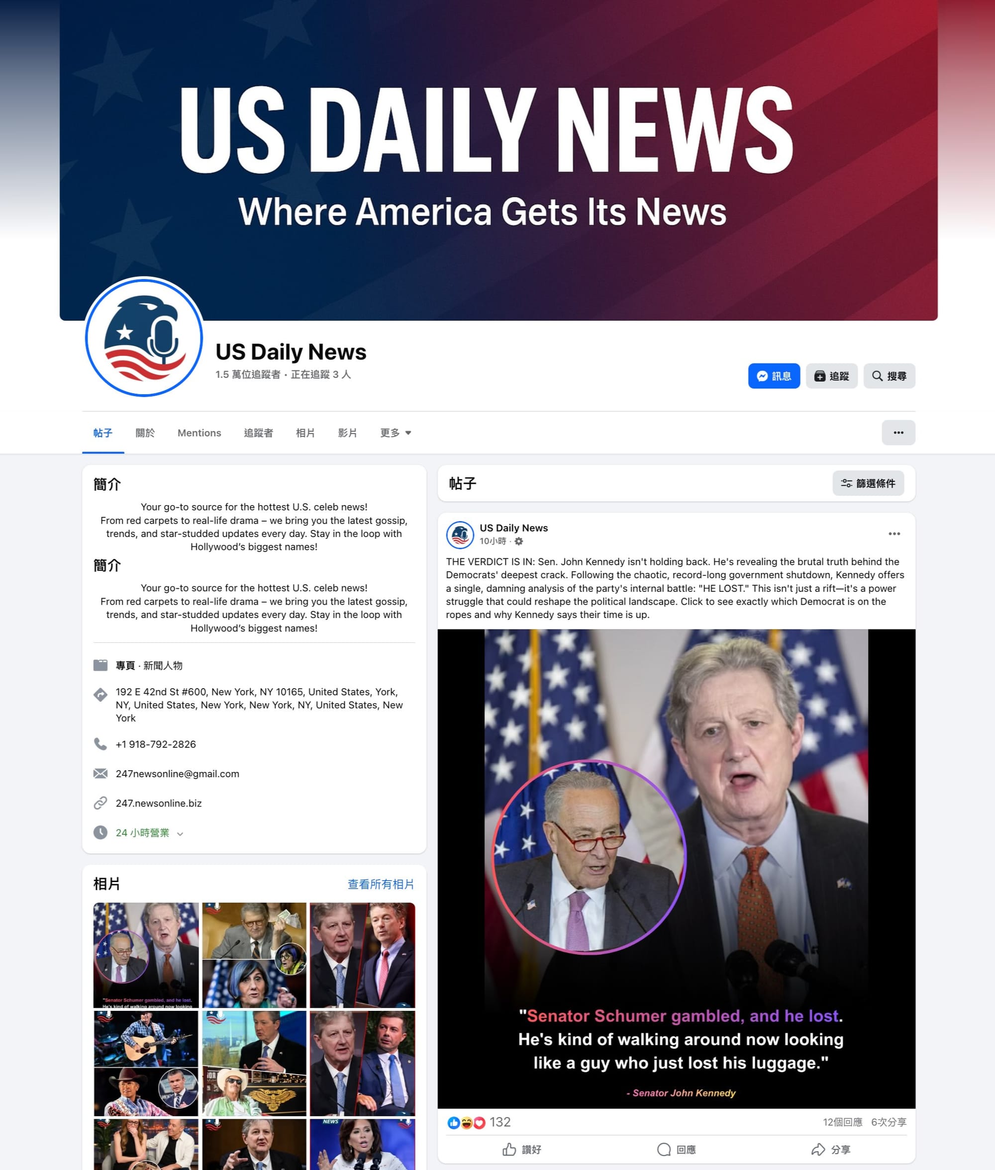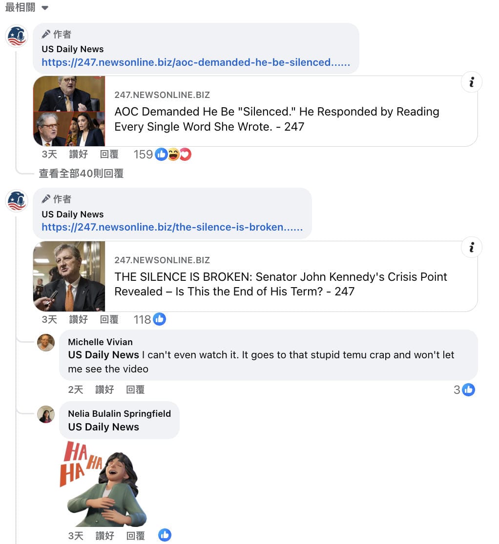 - Facebook專頁「US Daily News」,archive.today備份網頁