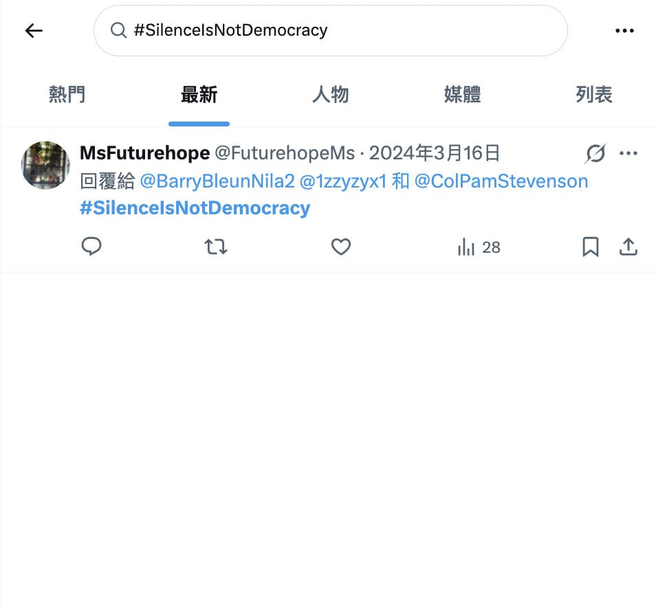 - 在X搜尋「#SilenceIsNotDemocracy」結果