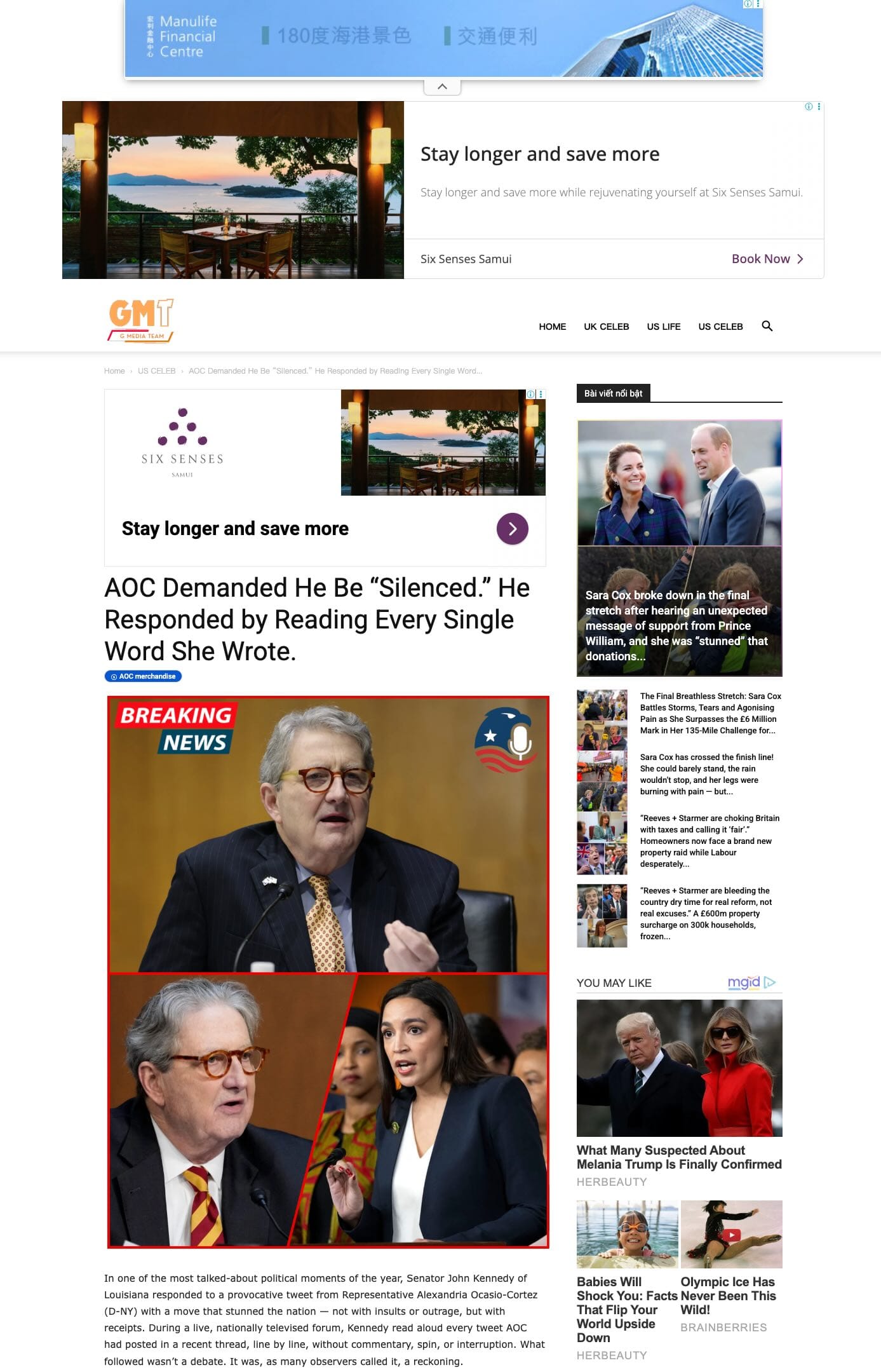 - 網站「GMT」並無介紹頁面,大部分文章與英國和美國的名人政客相關,頁面嵌入大量廣告,疑為批量生產文章以吸引流量、賺取廣告收入的內容農場網站。[25]