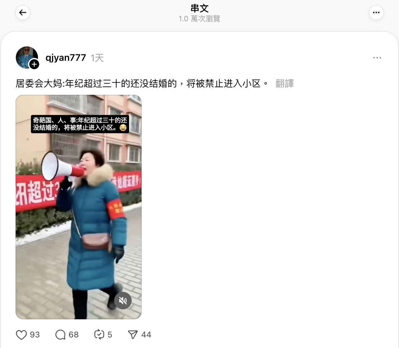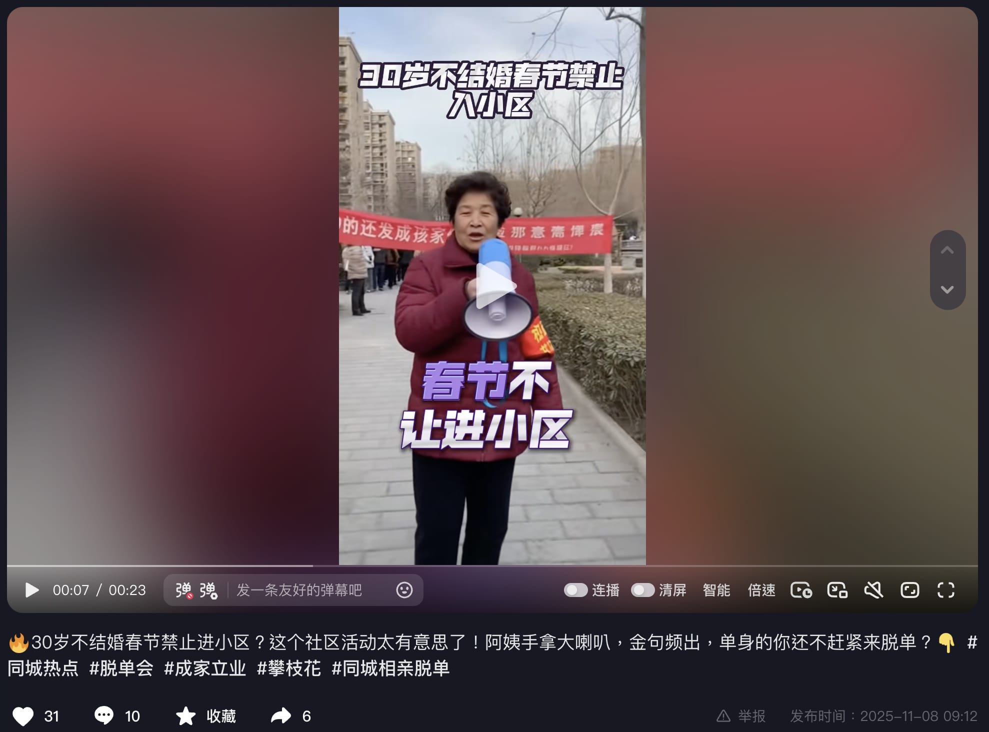 該影片上方字幕顯示「奇葩國、人、事:年紀超過三十的還沒結婚的,將被禁止進入小區。」影片合計獲得約93個表情反應、68個留言、49次轉發分享以及約1萬次查看。[1]