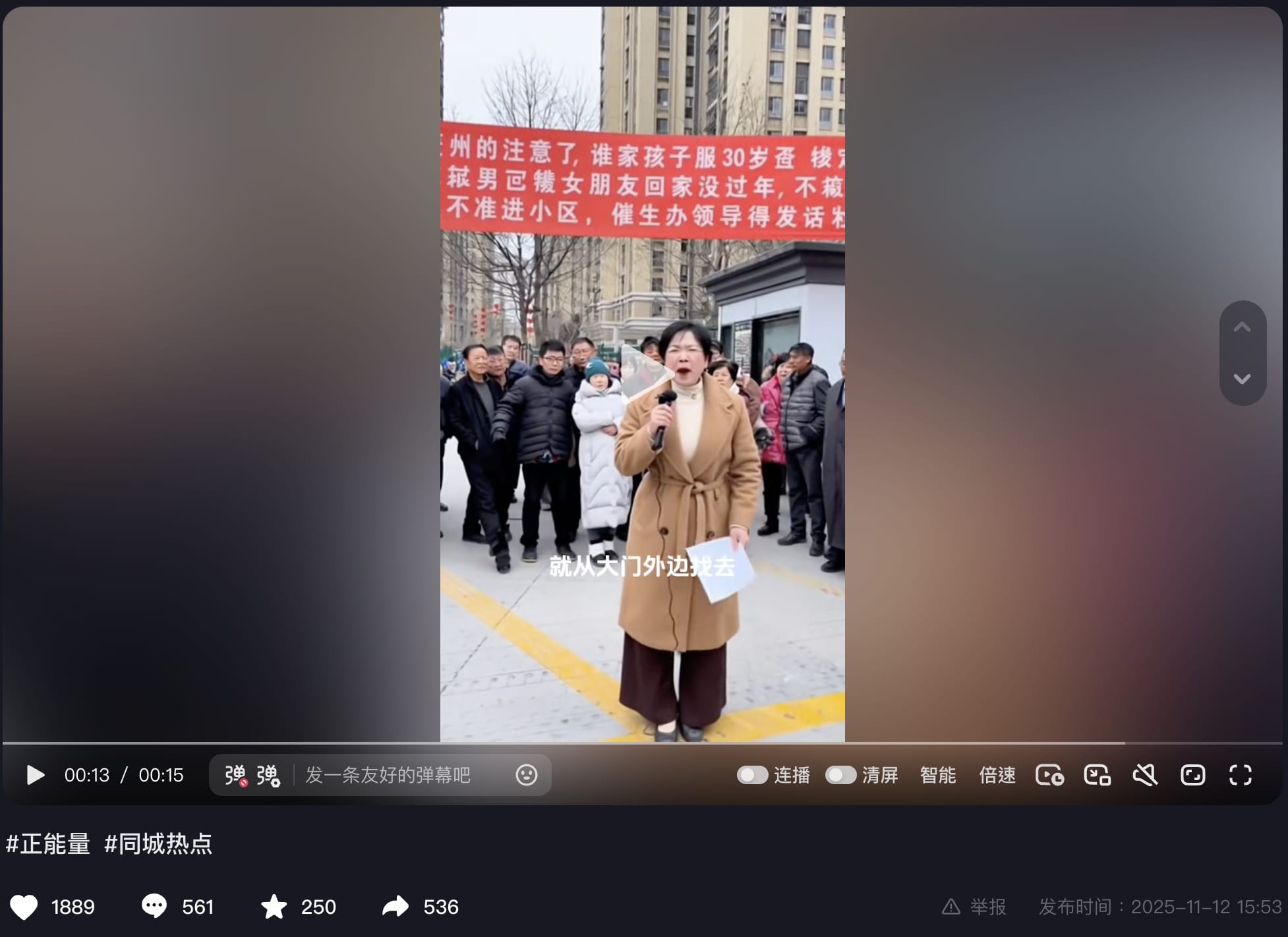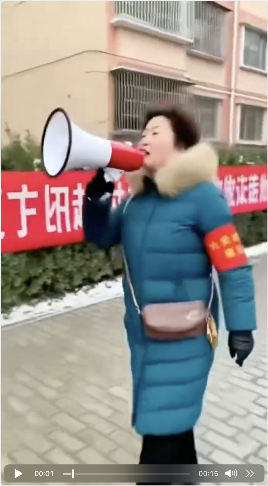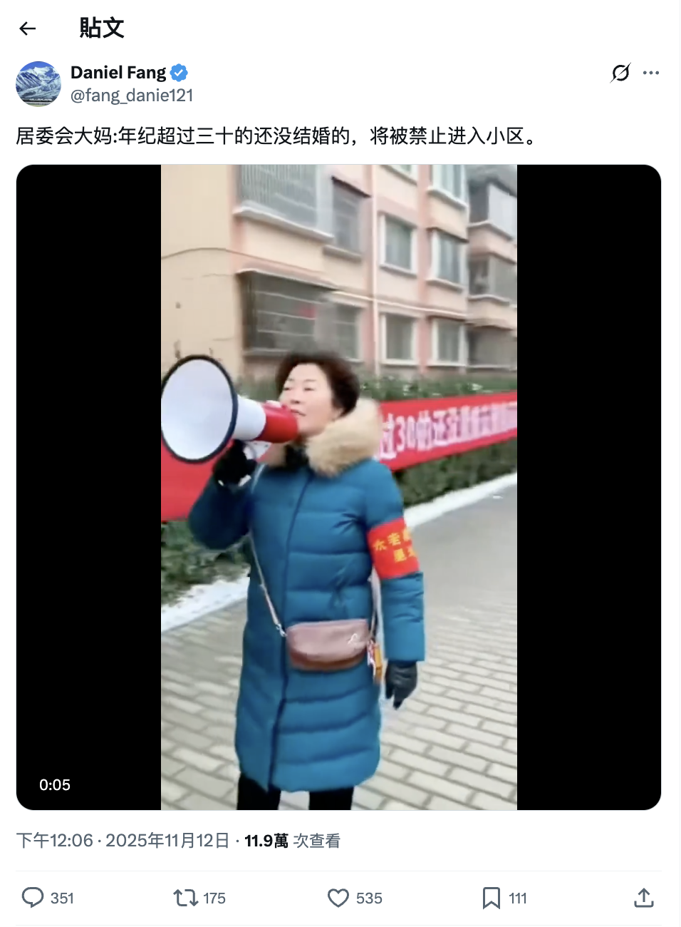 2025年11月12日,Threads用戶「qjyan777」發佈影片,片中一名手持擴音器、左臂戴紅色袖章的女人邊走邊說: