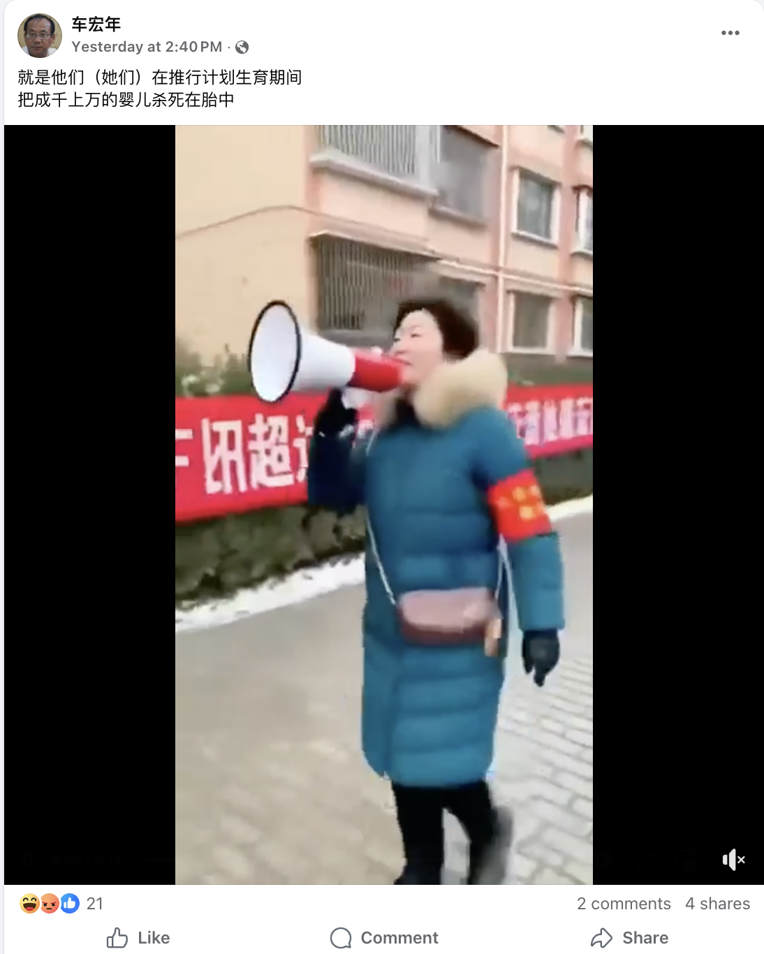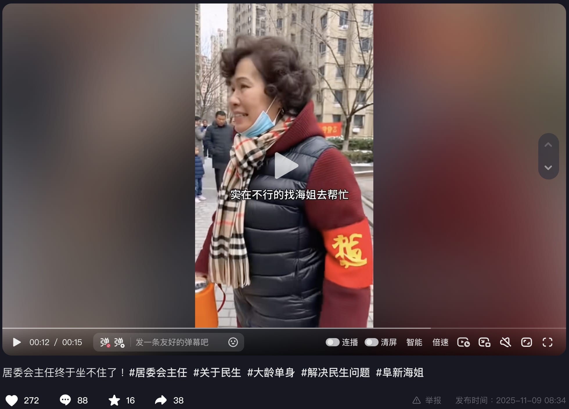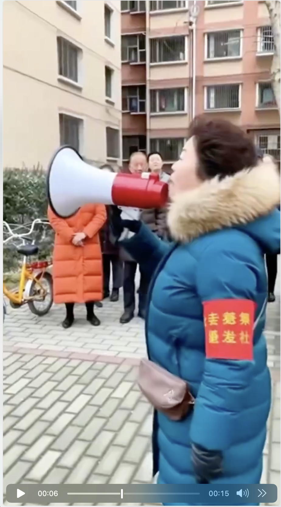 2025年11月12日,Threads用戶「qjyan777」發佈影片,片中一名手持擴音器、左臂戴紅色袖章的女人邊走邊說: