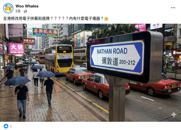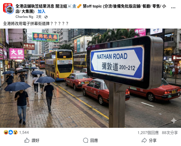 2025年11月24日,Facebook用戶「Charles Ng」於群組「全港店舖執笠結業消息 關注組☠️🏦🥜 禁off topic (分流/後備免批版店舖/ 餐廳/ 零售/ 小店/ 大集團) 」發佈一張街景圖片,當中顯示的彌敦道街名牌為螢幕,並附上一句「全港將改用電子拼幕街道牌?????」。有用戶留言批評街名牌毋需使用高科技、更換沒有必要以及多餘等,並獲得多個「讚好」及其他表情反應。[1,2]同日用戶「Woo Whales」亦有轉載該帖文及圖片,並加上一句「內有什麼電子儀器?🤔」。[3]