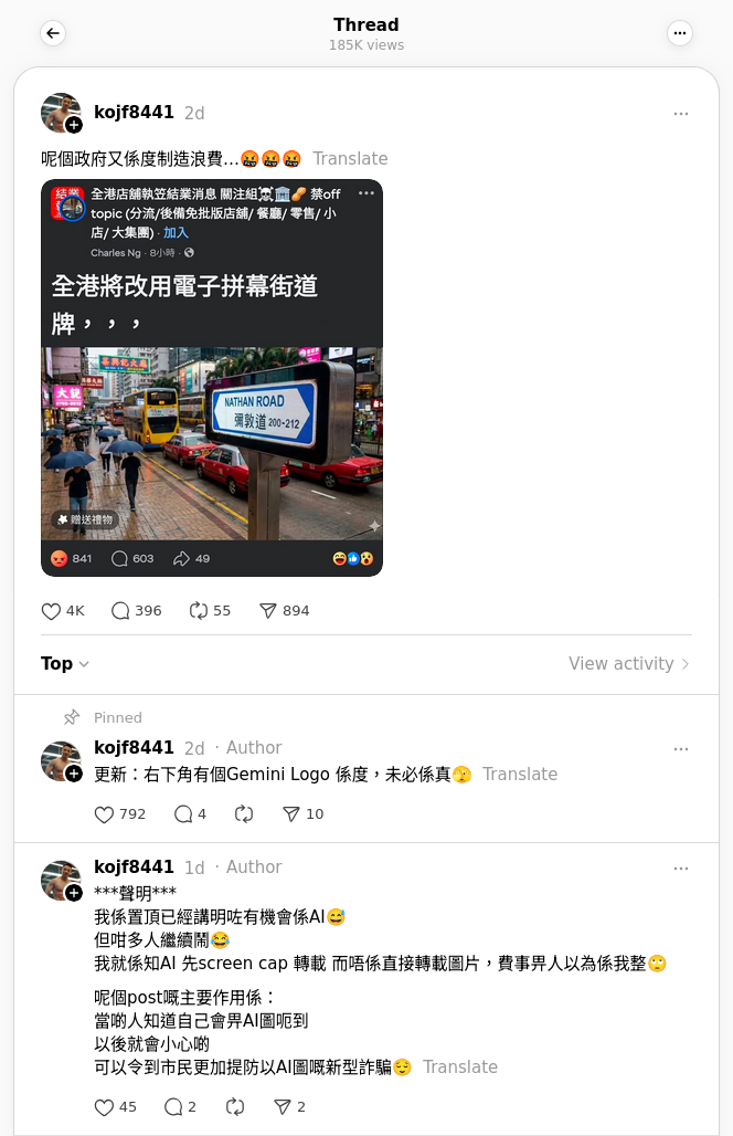 同日Threads用戶「Jeffrey KO」貼出「Charles Ng」的帖文截圖,並指政府又製造浪費,其後留言補充指圖片右下角有Google人工智能(AI)程式Gemini的標誌,未必是真實照片,然後再留言稱其帖文作用為令市民提防使用AI生成圖片的詐騙。[4]