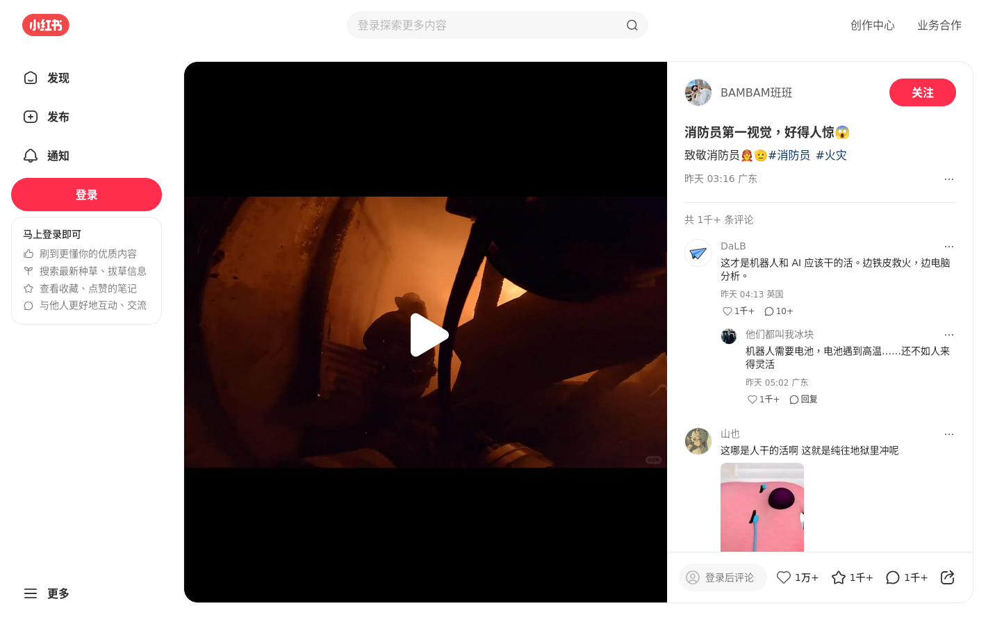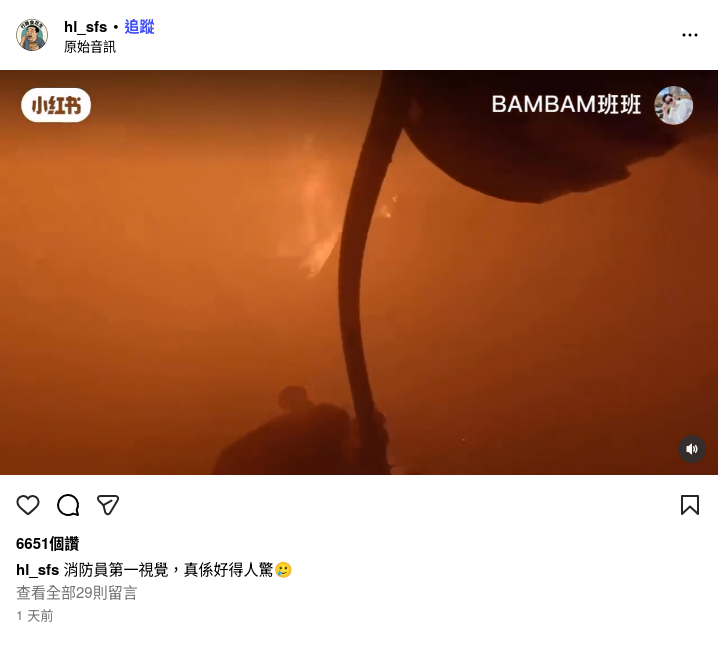 同日Instagram及Facebook上亦有用戶發佈同一影片,惟並無提及宏福苑火災。Instagram用戶「hl_sfs」發佈的影片獲得6,651個讚,影片跟上述Threads影片一樣有「小紅書」標誌及文字「BAMBAM班班」。Facebook專頁「娱乐最新资讯-Fans」的影片並無相關標誌和文字,其帖文以簡體字表示「消防员第一视觉,好得人惊」及「致敬消防员」。該影片獲得8,735個表情反應、454個留言、1,147次分享及超過66萬次觀看。[5,6]
