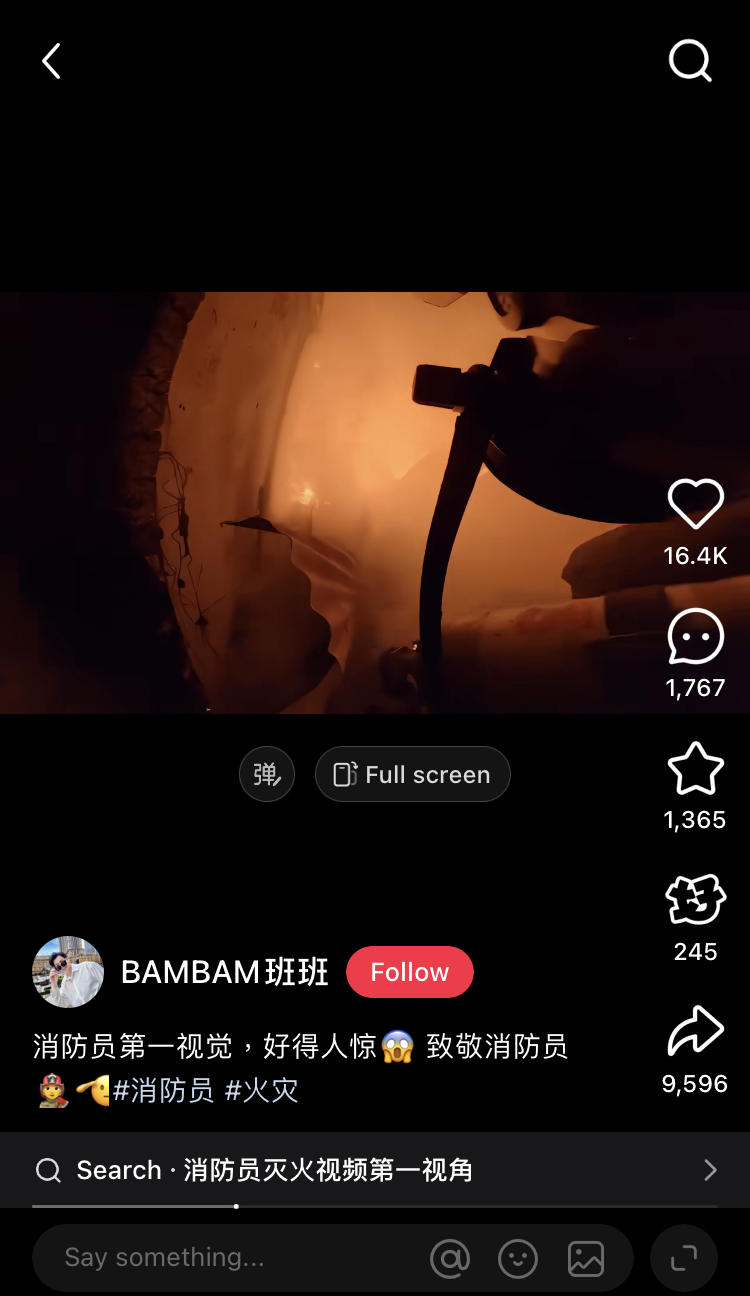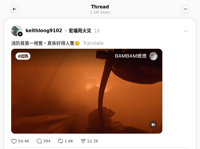 2025年11月27日,Threads用戶「keithlong9102」發佈一段火場影片,表示「消防員第一視覺,真係好得人驚🥲」(應為「視角」),並於帖文加上主題「宏福苑火災」。影片角落可見中國社交媒體小紅書的標誌、「BAMBAM班班」及一張圓形圖片。帖文獲得逾150萬次瀏覽、5,400次讚好、394個留言及14,000次分享。[4]