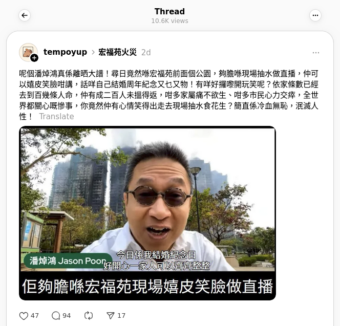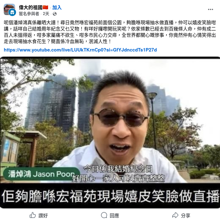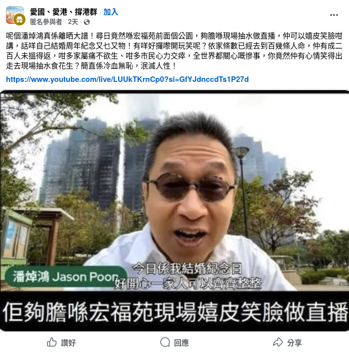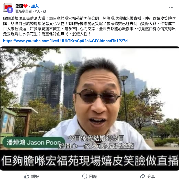 宏福苑大火後,社交媒體流傳圖片及帖文,宣稱中科監察主席潘焯鴻在宏福苑附近直播,圖中字幕為「今日係我結婚紀念日 好開心一家人可以齊齊整整」。