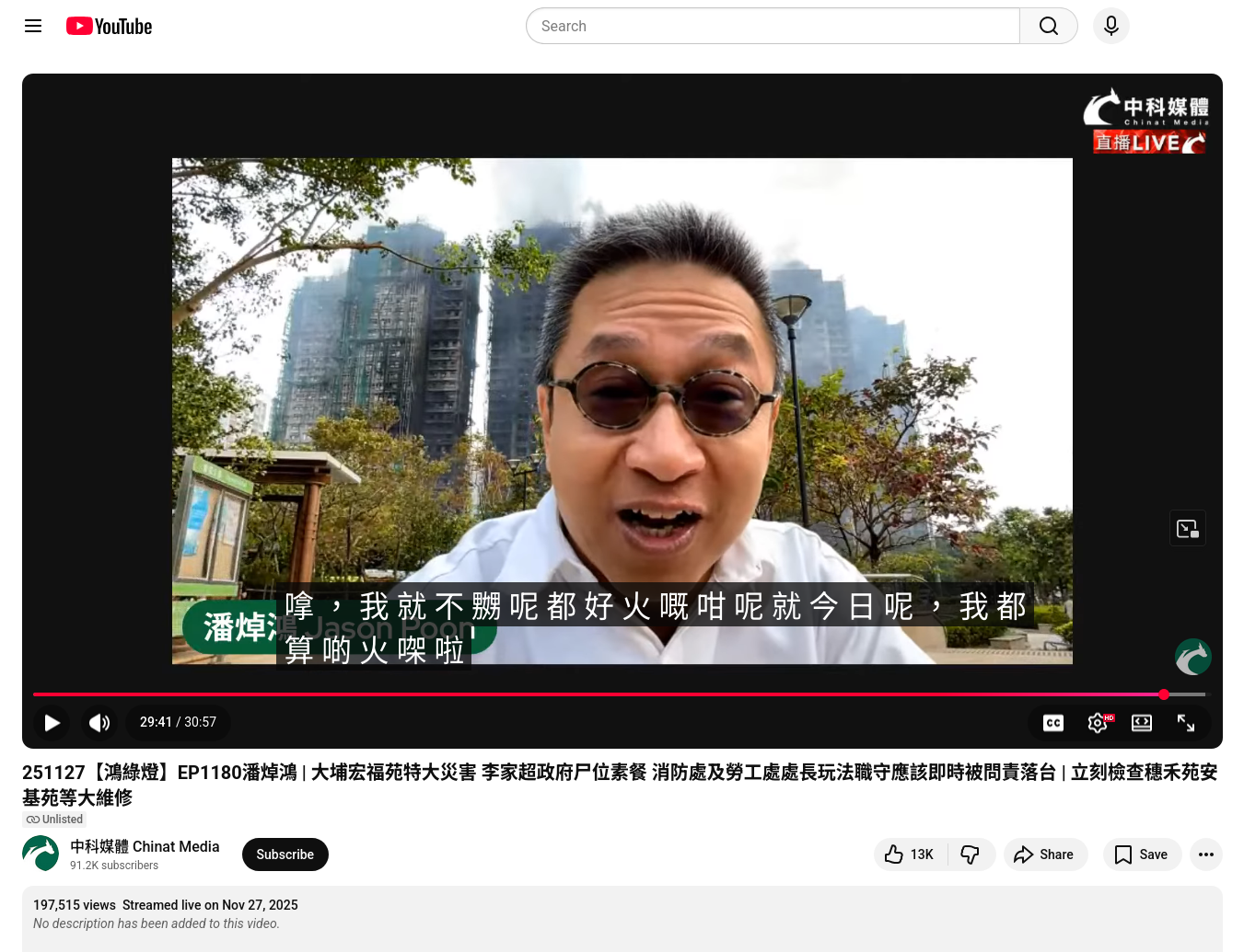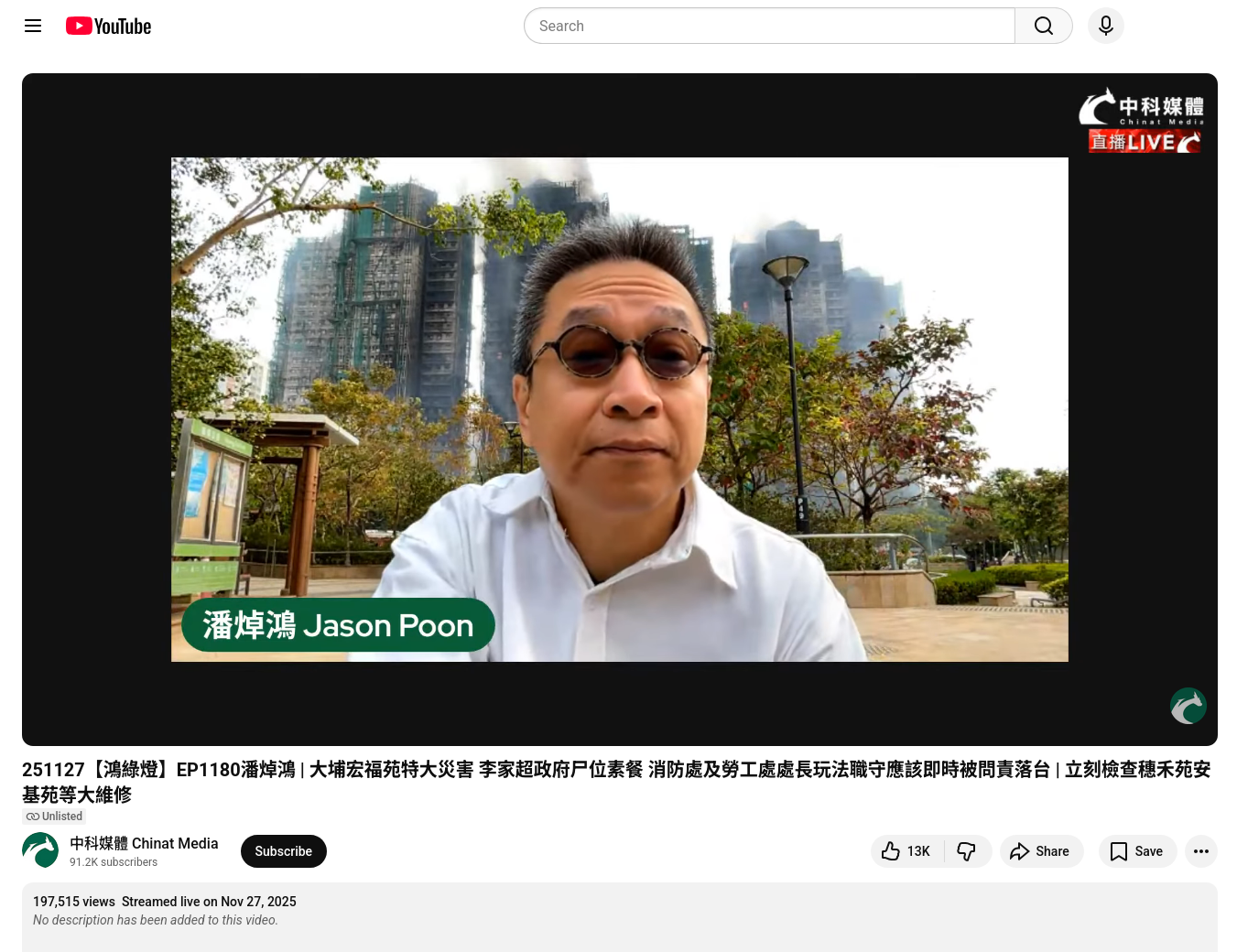 - 251127【鴻綠燈】EP1180潘焯鴻 | 大埔宏福苑特大災害 李家超政府尸位素餐 消防處及勞工處處長玩法職守應該即時被問責落台 | 立刻檢查穗禾苑安基苑等大維修(YouTube / 中科媒體 Chinat Media),Wayback Machine備份網頁