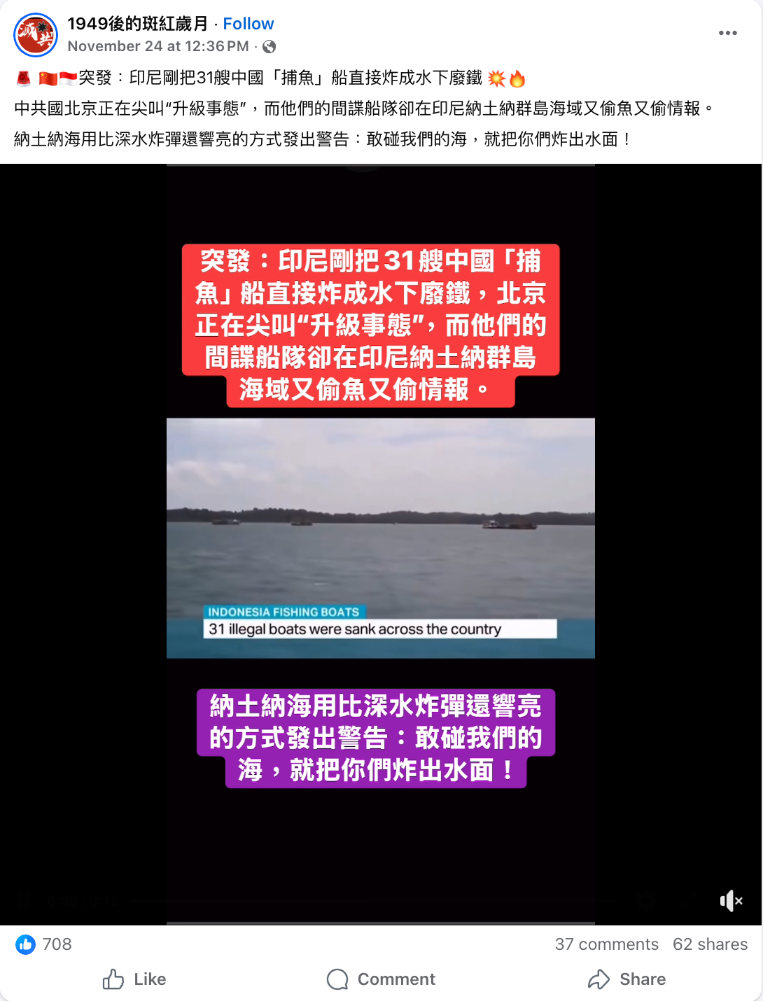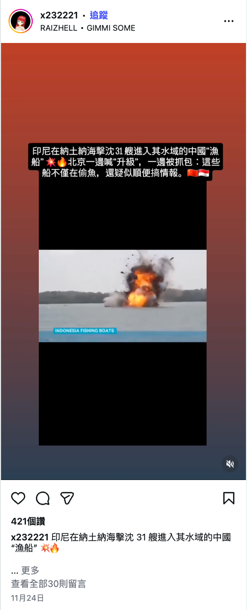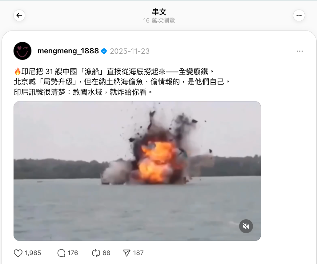 2025年11月23日,Threads用戶「mengmeng_1888」發佈一條船隻爆炸的影片,並宣稱印尼從海底撈起31艘中國船隻後將之炸毀。影片合計獲得約1,985個表情反應、176個留言、255次轉發分享以及約16萬次查看。[1]