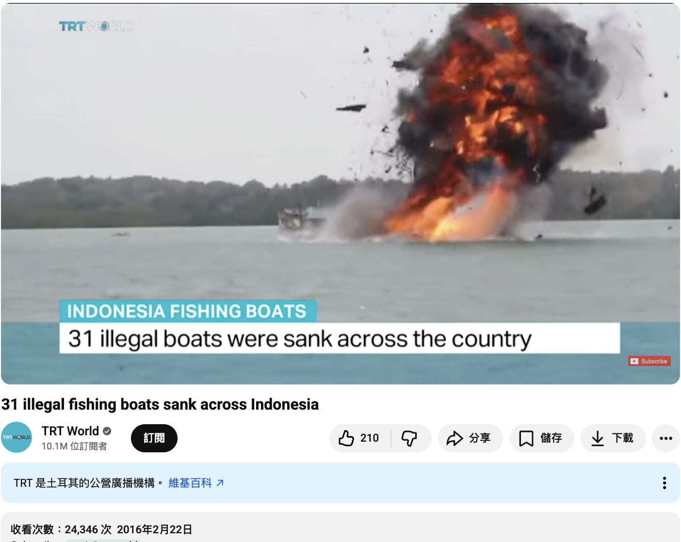 上述帖文均未提及影片來源。回顧影片,第2至9秒時畫面下方出現英文字幕顯示「Indonesia fishing boats」及「 31 illegal boats were sank across the country」。根據影片中的英文字幕,在Google搜尋「Indonesia fishing boats 31 illegal boats were sank across the country」(印尼漁船 全國31艘非法船隻被擊沉船),可以發現土耳其媒體《TRT World》於2016年2月22日發佈在其YouTube頻道的報導影片。[4]影片的第6至16秒畫面與網傳影片一致,包括畫面中的爆炸場景、停於水面上的3艘船以及影片下方的英文字幕。