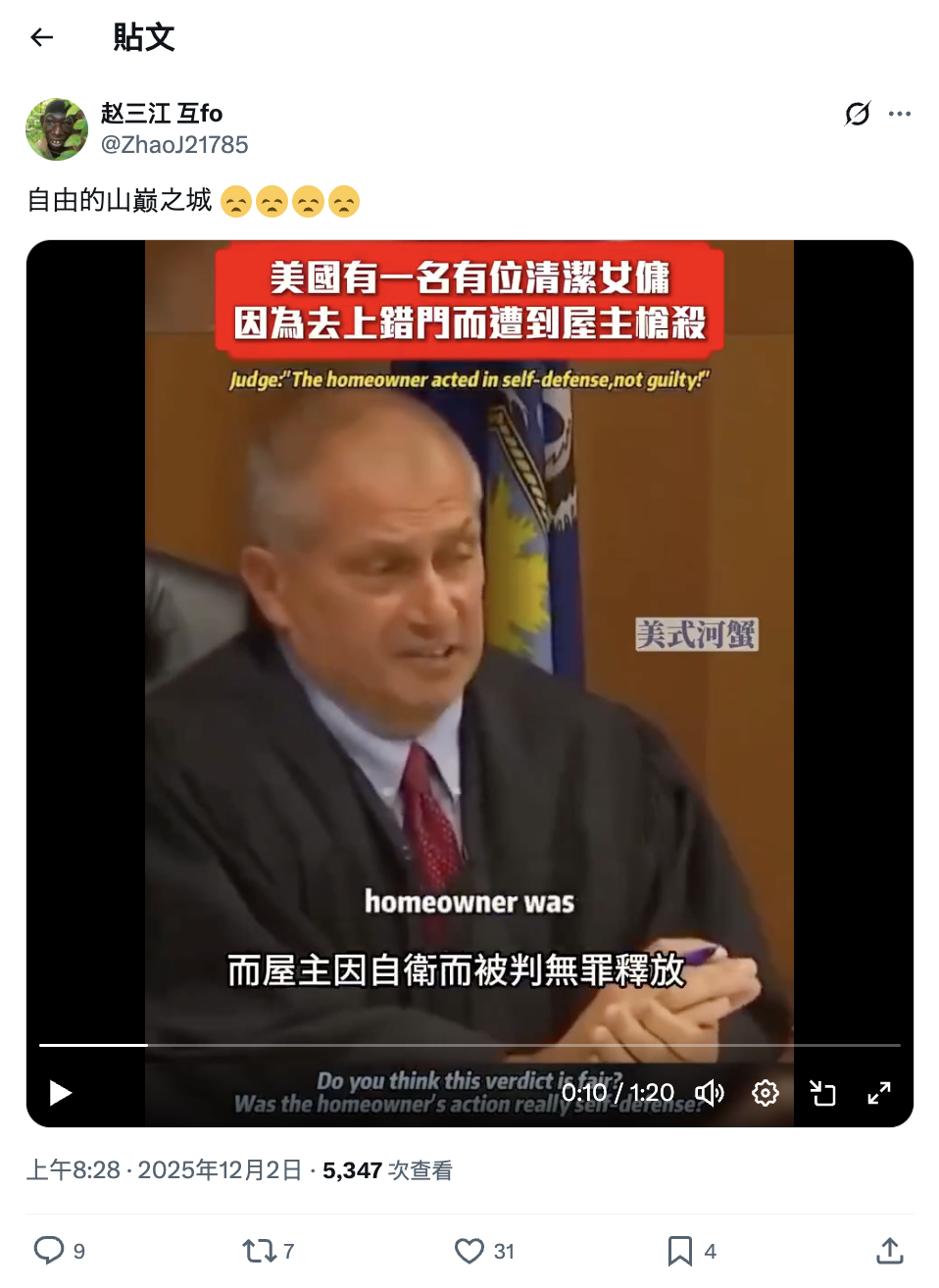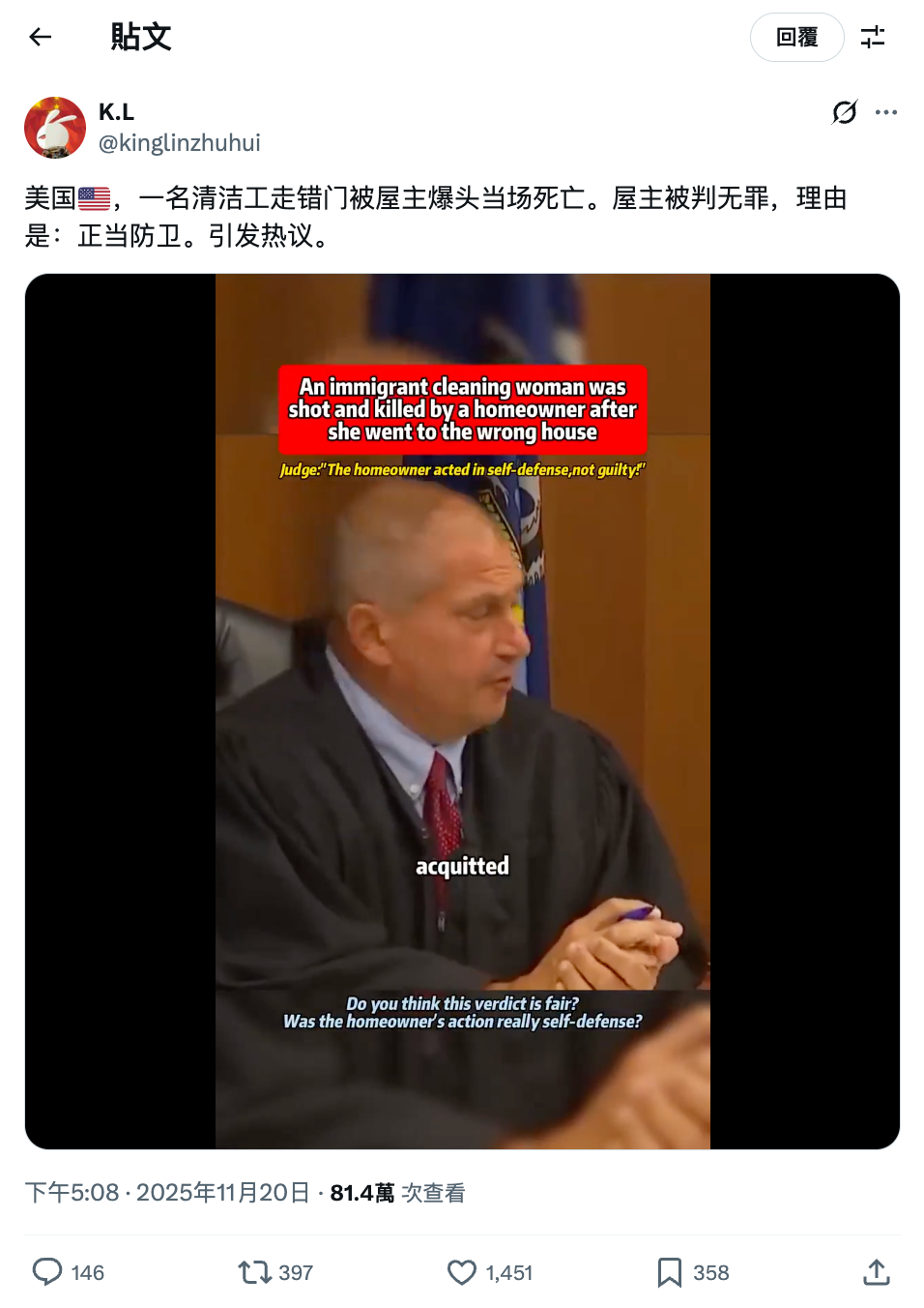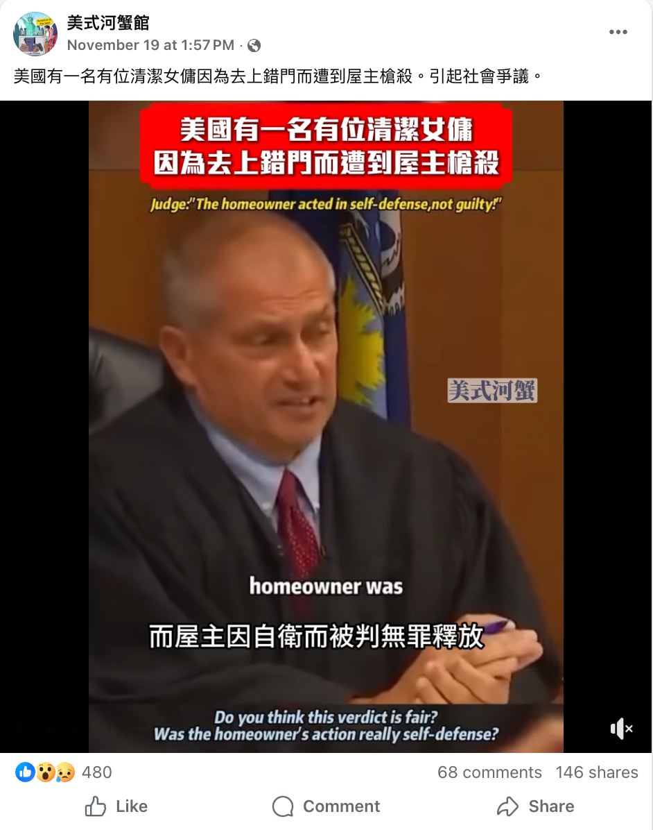 2025年11月19日,Facebook專頁「美式河蟹館」發佈影片,宣稱美國一名屋主槍殺了上錯門的清潔女工,卻因行為被認定為正當防衛,最終獲判無罪。帖文獲得480個表情反應、68個留言、146次轉發分享以及約9.1萬次查看。[1]