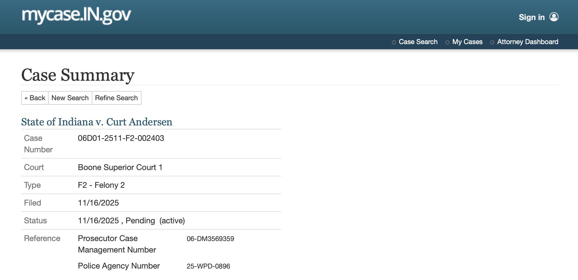 - 在mycase.in.gov搜尋「Curt Andersen」,Archive.today備份網頁