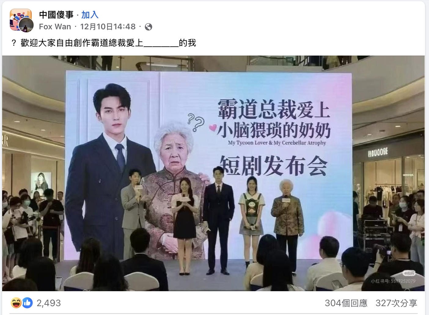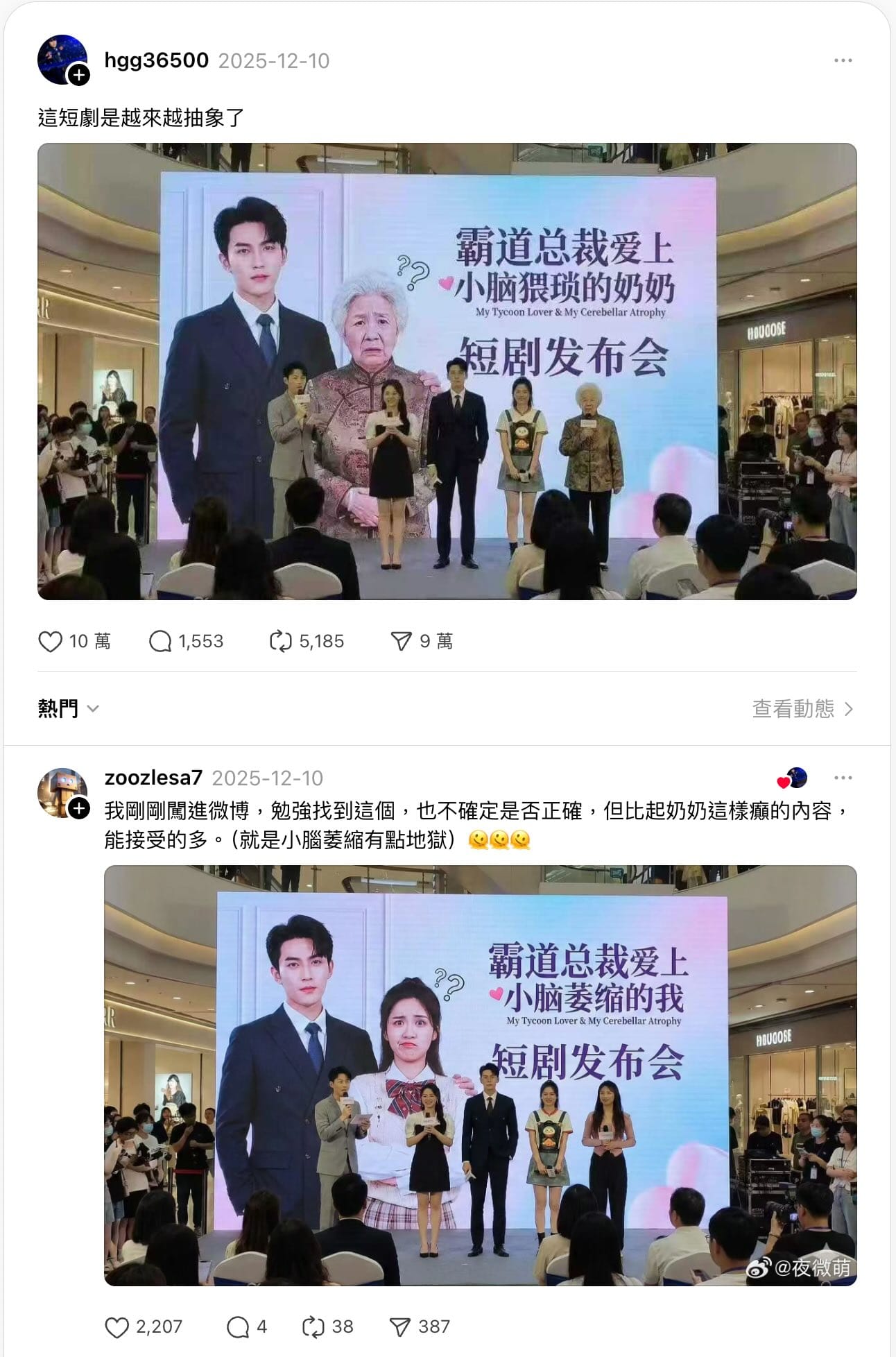 2025年12月,網傳兩張短劇發佈會現場的圖片,圖中劇名分別為《霸道總裁愛上小腦萎縮的我》及《霸道總裁愛上小腦猥瑣的奶奶》。