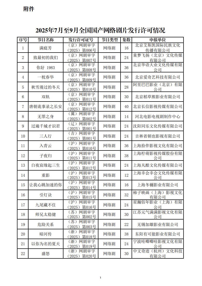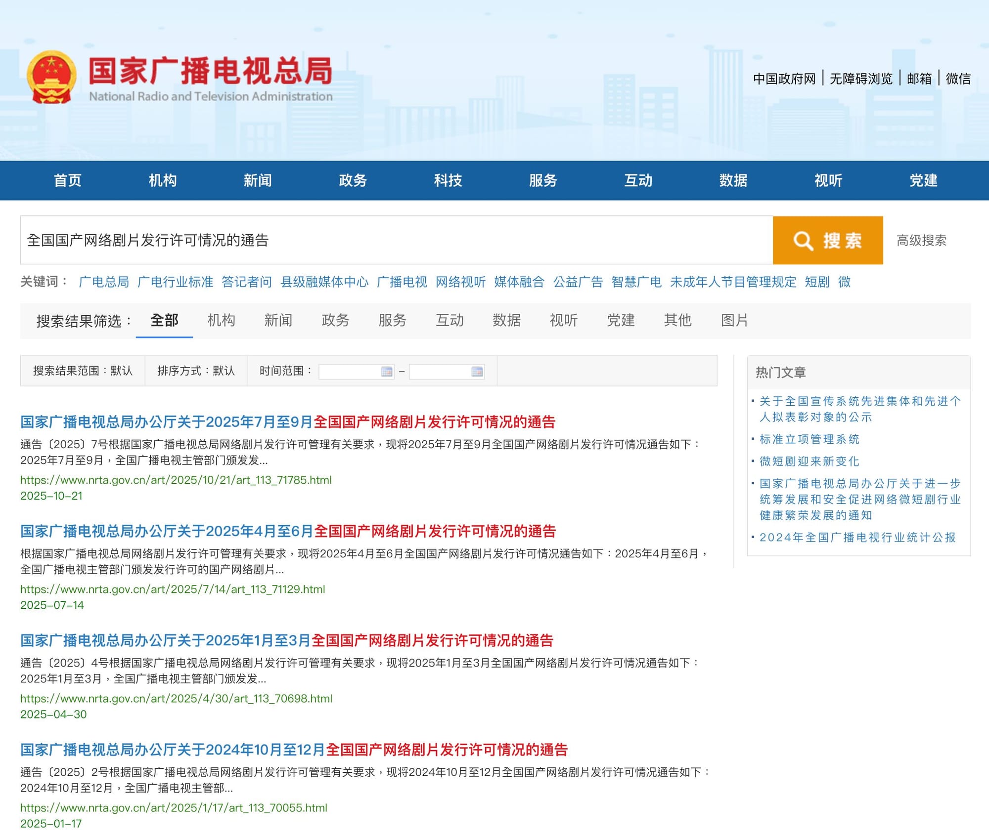 - 国家广播电视总局办公厅关于2025年7月至9月全国国产网络剧片发行许可情况的通告,archive.today備份網頁。附件中的PDF文件,archive.today備份網頁。