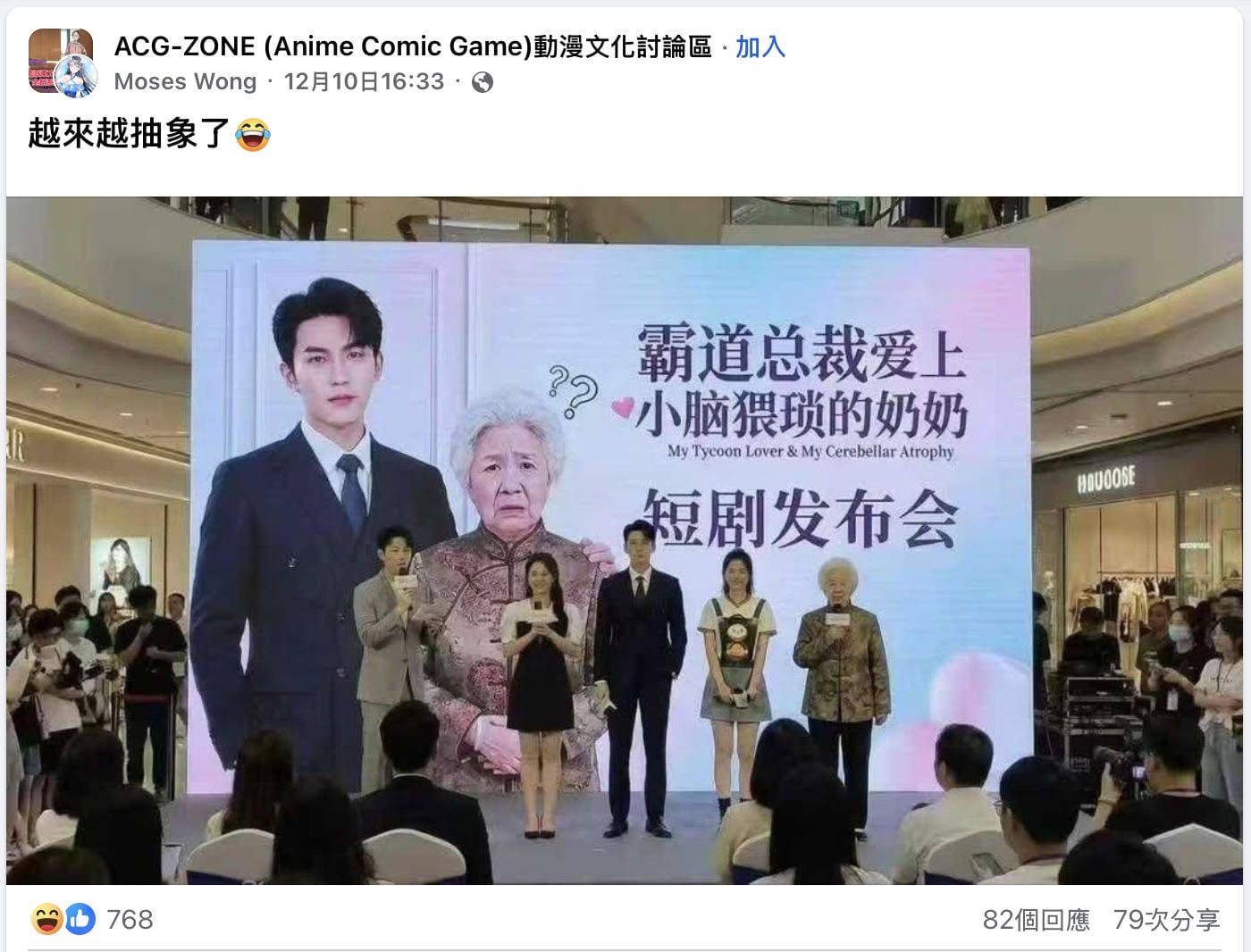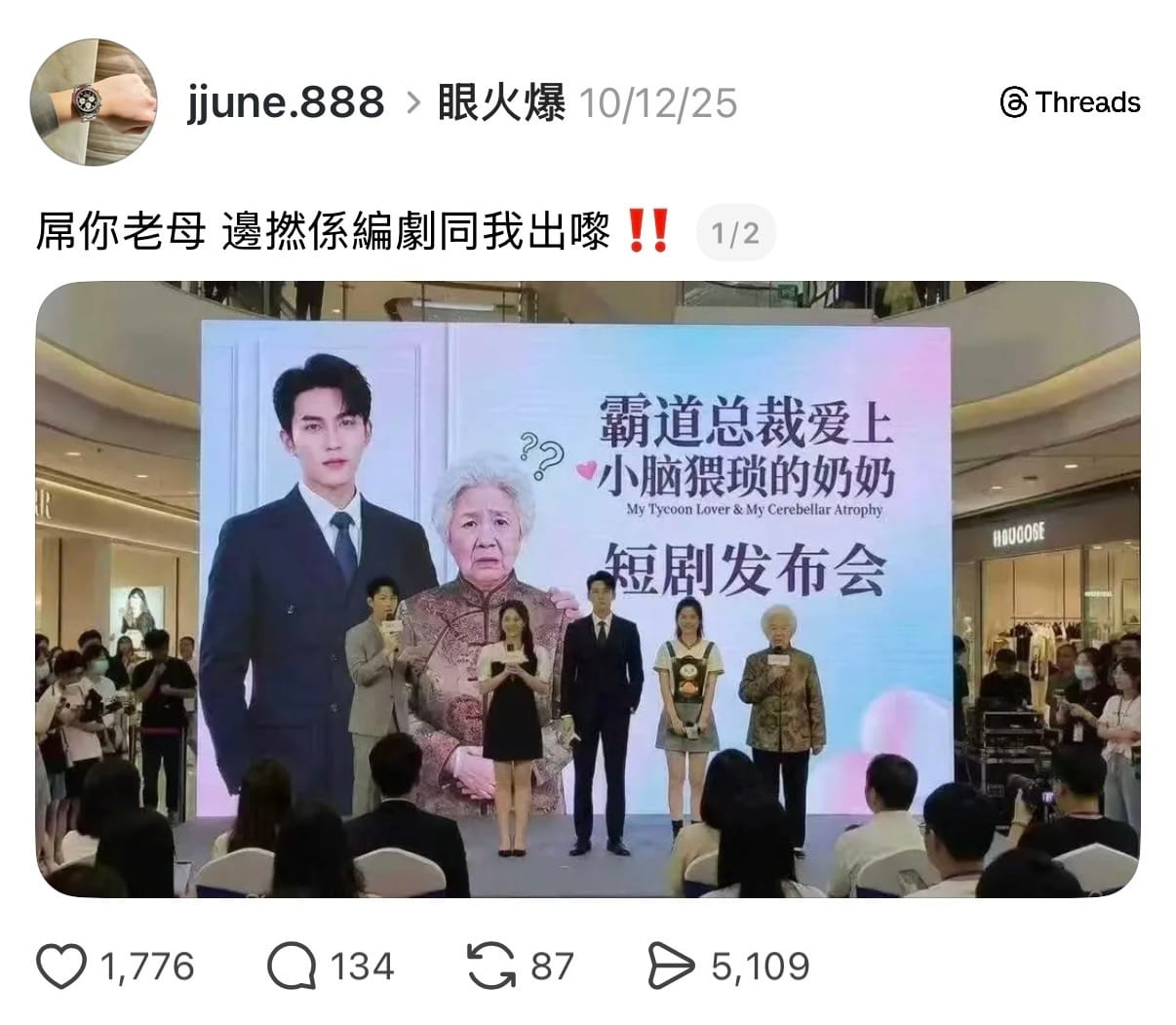 2025年12月10日,Threads用戶「hgg36500」和「jjune.888」發佈一張短劇發佈會現場的圖片,圖中佈景板顯示一年輕男子和年長女性,劇名為《霸道總裁愛上小腦猥瑣的奶奶》。用戶「zoozlesa7」在「hgg36500」帖文下方貼出另一版本的圖片,佈景板為同一男子和另一年輕女子,但劇名為《霸道總裁愛上小腦萎縮的我》。以上兩則帖文共獲得逾102,207個讚好、1,557個留言、5,223次分享及超過315萬次檢視。[1,2]
