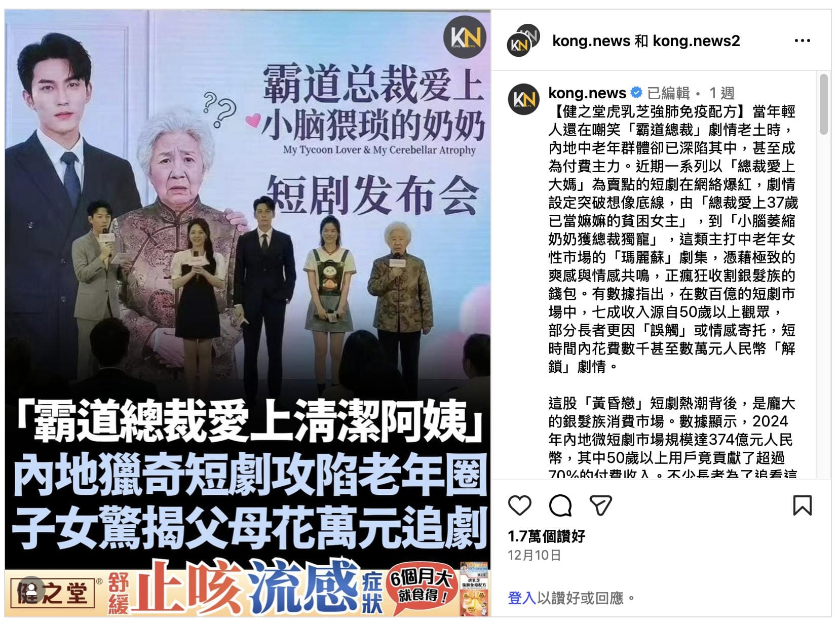 Instagram帳戶「港新聞 Kong News」於12月11日發佈相同場景圖片,圖片下方顯示標題「『霸道總裁愛上清潔阿姨』內地獵奇短劇攻陷老年圈 子女驚揭父母花萬元追劇」及一款流感藥物的廣告橫幅。帖文獲得1.7萬個讚好及228個回應。[5]